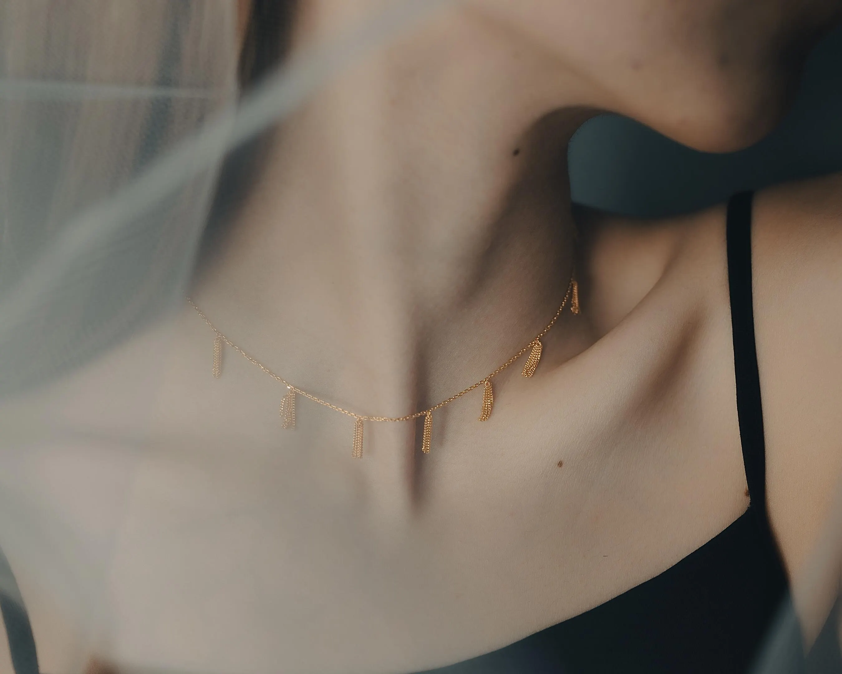 首を横に傾げたり振り向いたときに鎖骨や首周りの筋肉が 浮き上がりフリンジがふわりと静かに靡く。 金属の房が胸元にヒヤリとしたあたった時の緊張感、 次第に自分と同じ温度になり素肌に馴染みます。