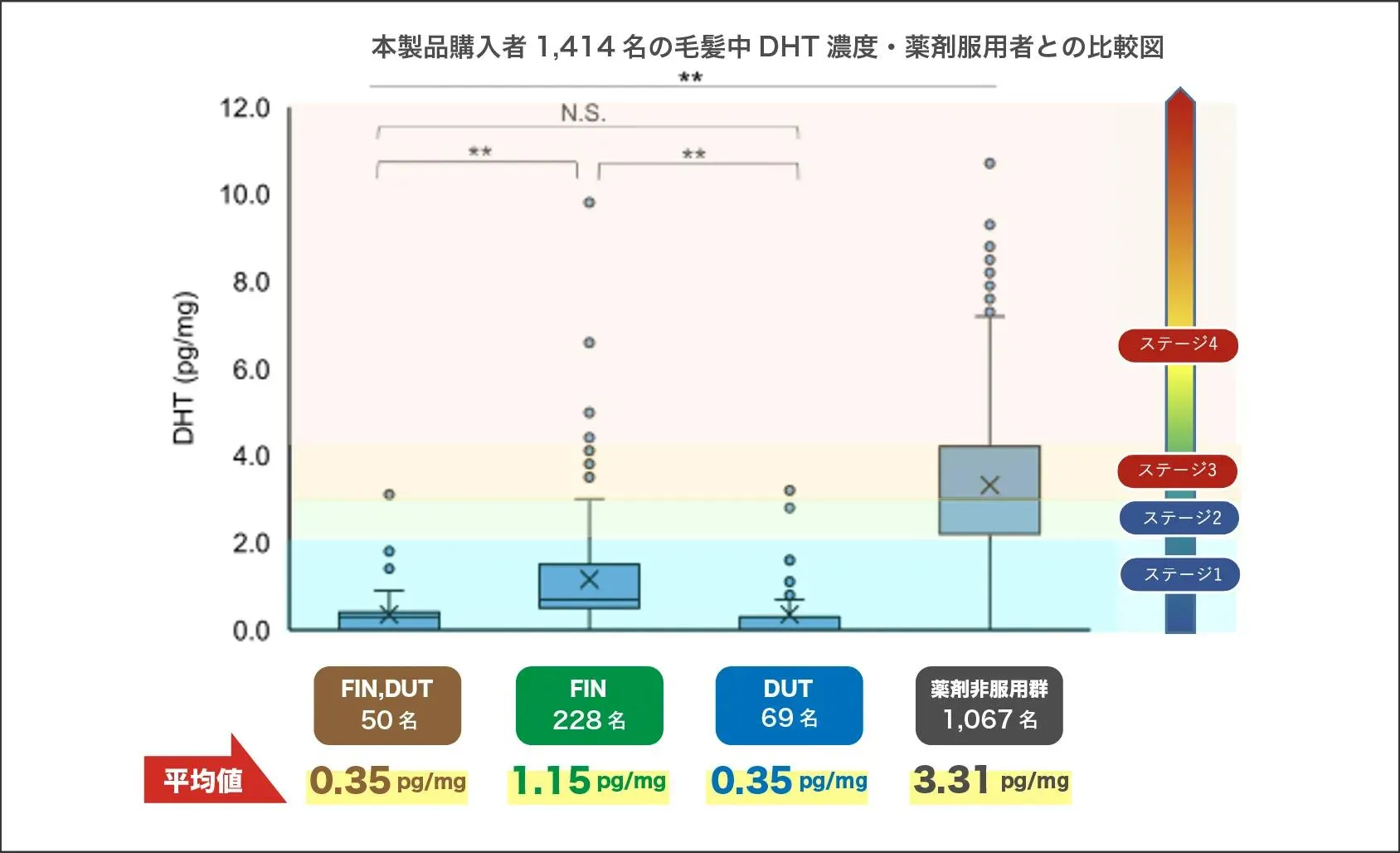 なお、DHT生成抑制作用を有するフィナステリド(FIN)、デュタステリド(DUT)が検出された被験者を各薬剤服用者とし、以下の4群に分け各群の毛髪中DHT濃度を比較しました。