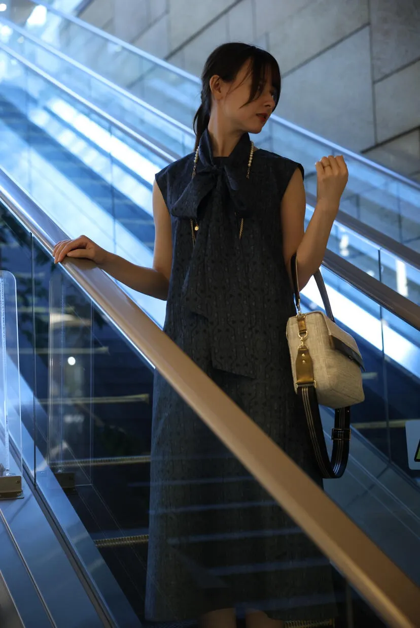 また、共布地ロングスカーフを首元に結びボウタイアレンジを楽しんでいただけます。
