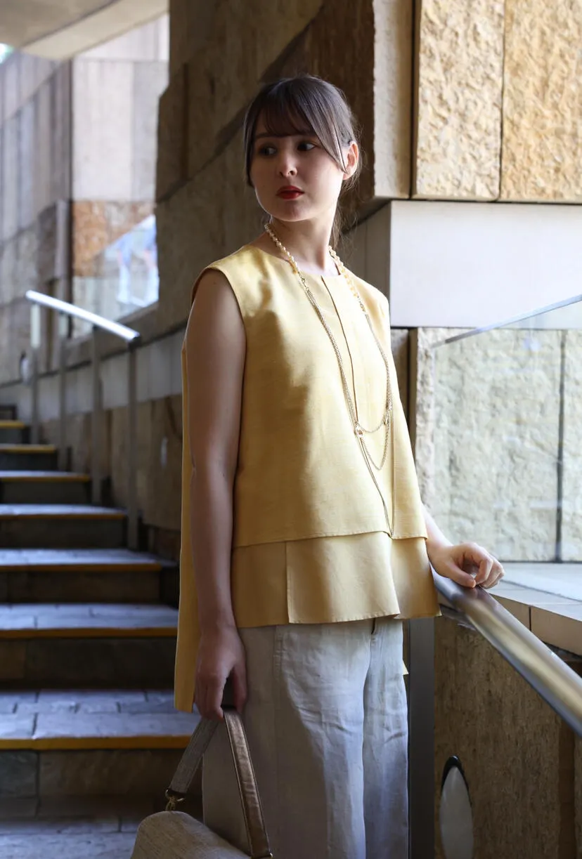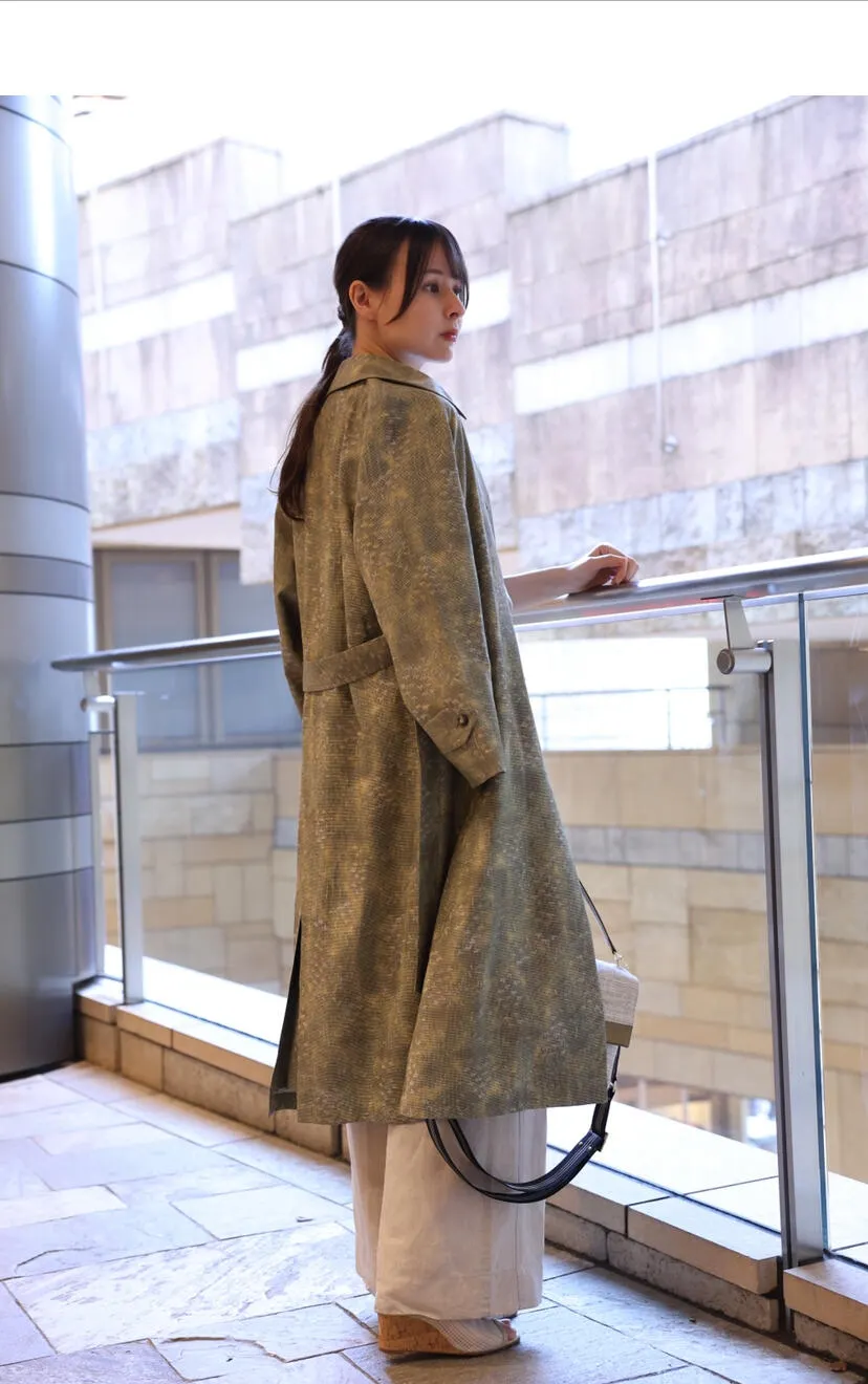 長めの着丈のすっきりとしたシルエットが着こなしのバランスを美しく見せてくれます。 しかも正絹の紬のしなやかな風合いと軽さがこれまでのトレンチコートは重いというイメージをくつがえしてくれます。