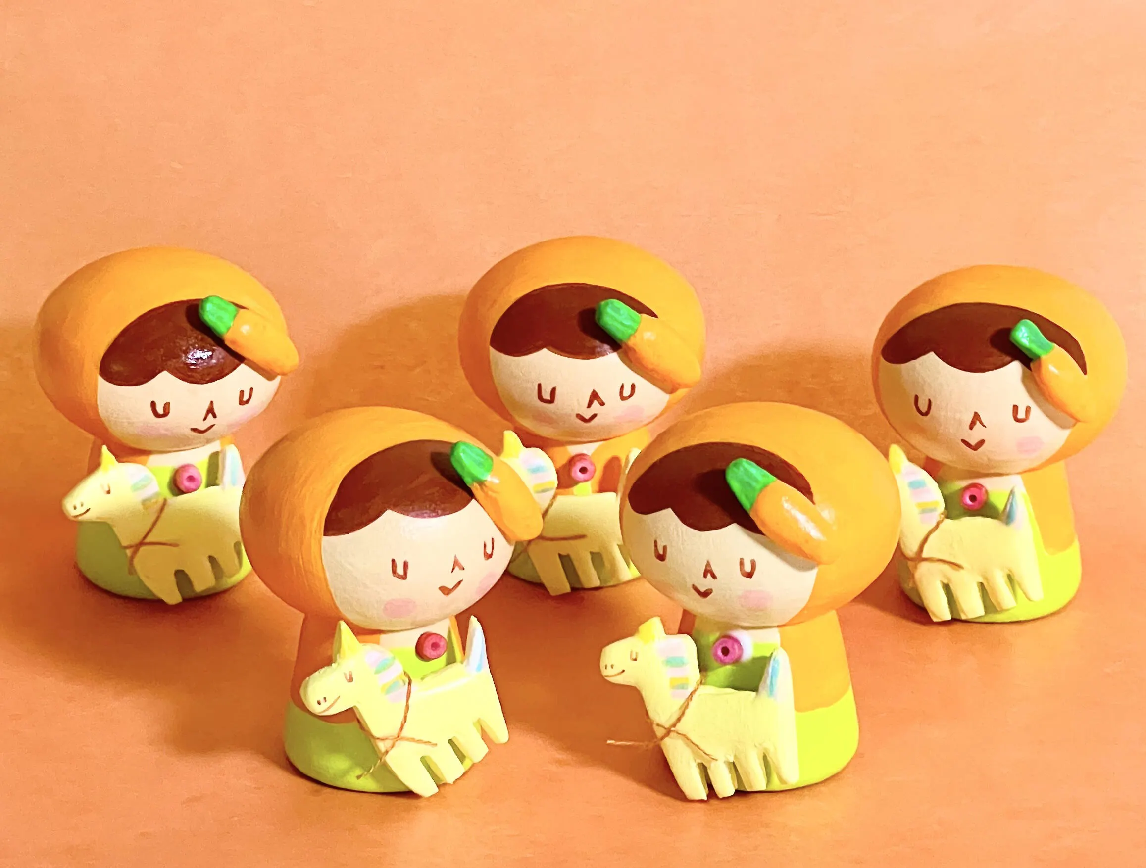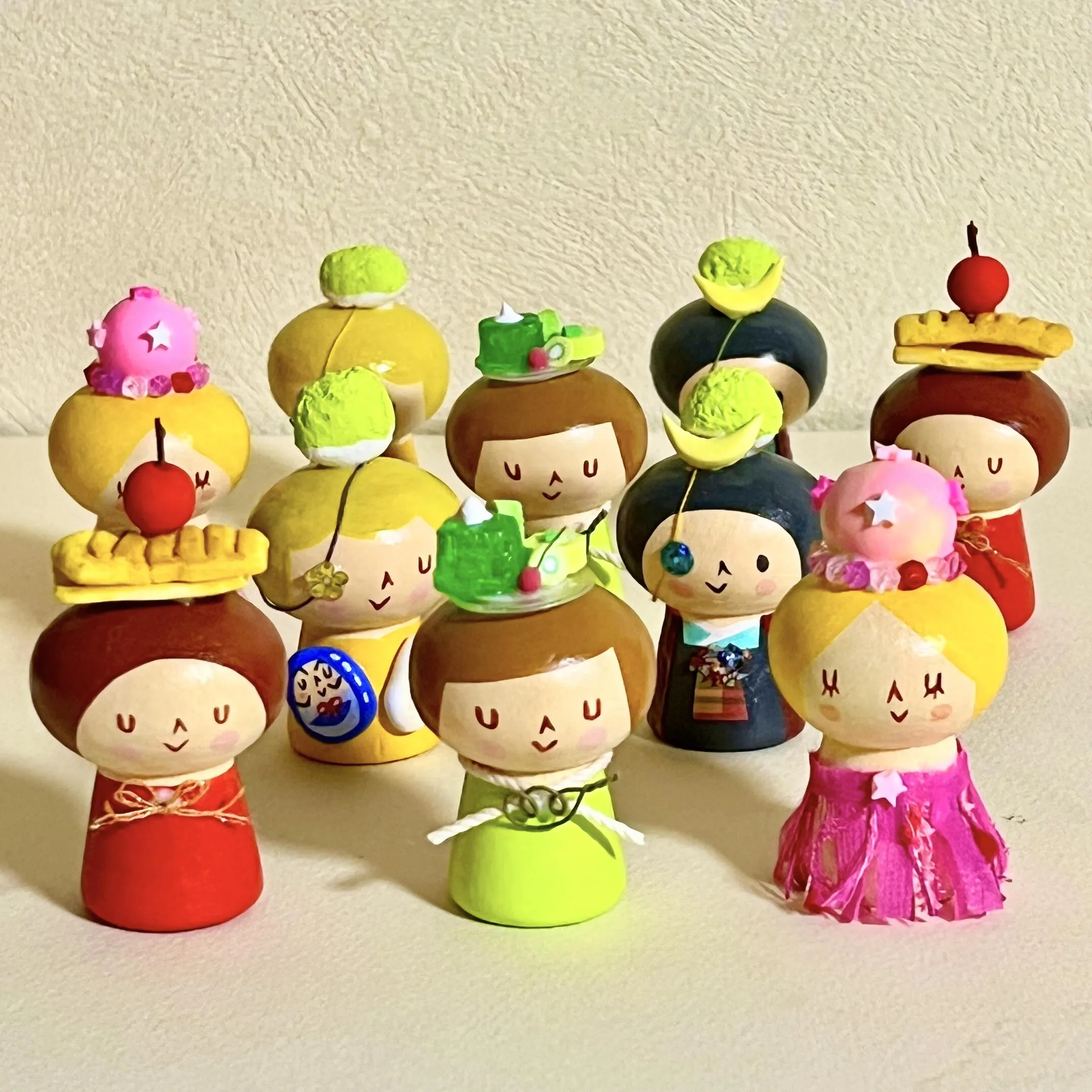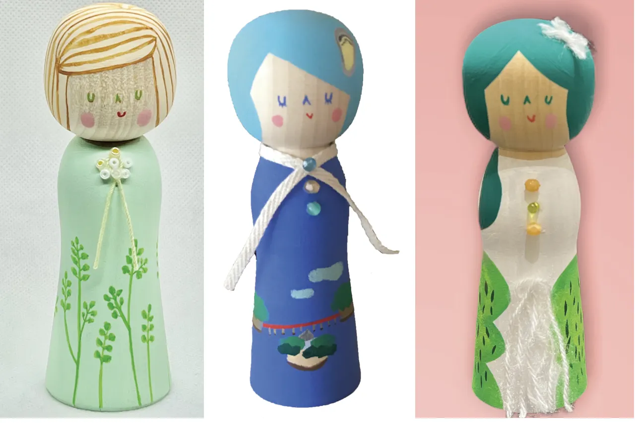 創作こけしちゃんのベースの木地は、工人さん制作のものや天然木のペグ人形を使用。