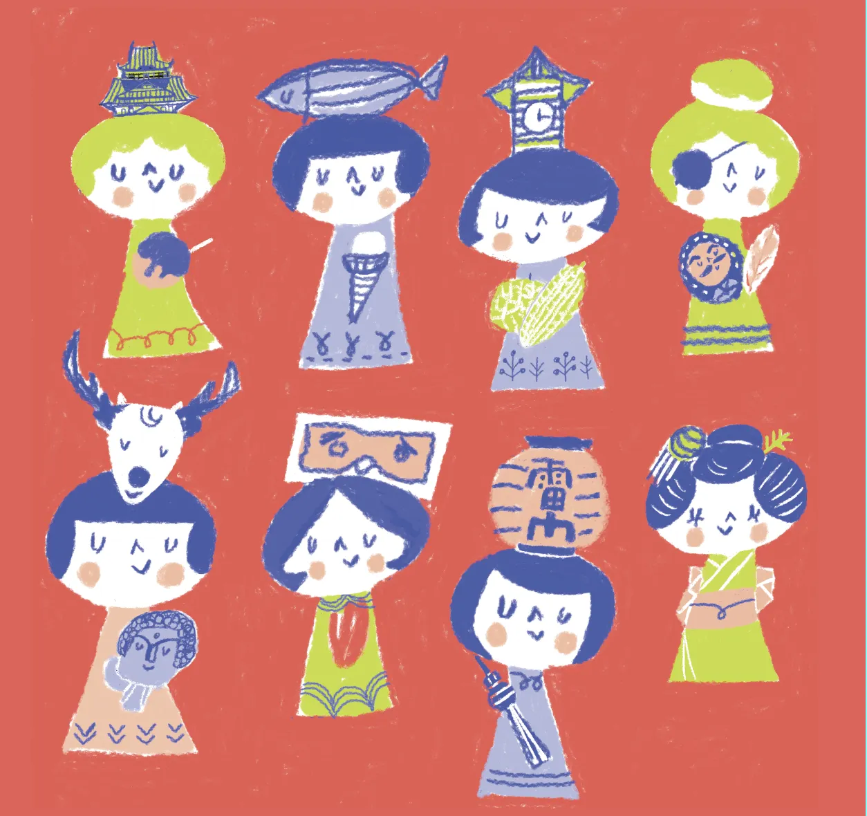 季節の風物詩や人気のスイーツを頭に乗せて、季節感や地域感を出しています。