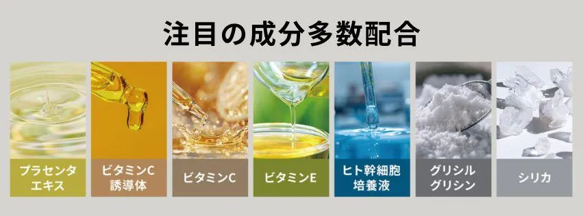 ビタミンCやプラセンタエキス、ヒト幹細胞培養液エキスなどの人気成分も配合し、オールインワンでありながら“中身重視”の本格的なスキンケアを実現しています。