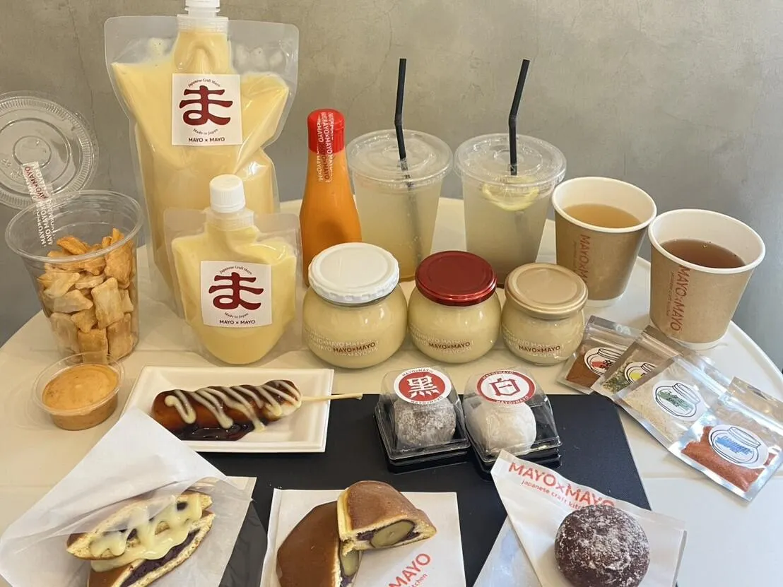 実店舗では、MAYO×MAYOマヨを使ったオリジナル商品も豊富にご用意。例えば、8種類のディップから選べる「ディップおかき」は、サクサクのおかきとマヨネーズの新しい組み合わせで、ちょっとしたおやつやお土産にもぴったり。また、「クリームチーズにほうじ茶orはちみつのマヨ入り大福」や、「みたらし団子マヨ」など、和と洋の垣根を越えたユニークな商品も展開しています。