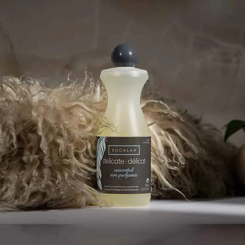 「ユーカラン」という名前は、主要成分であるユーカリとラノリンを組み合わせた造語です。ラノリンは羊毛から抽出される天然の脂質で、古代から人の肌や繊維のケアに使われてきました。ウールやカシミヤなどのデリケートな素材は、洗濯のたびに油分が失われがちですが、ユーカランはそのラノリンを補いながら、衣類本来の風合いを守ります。