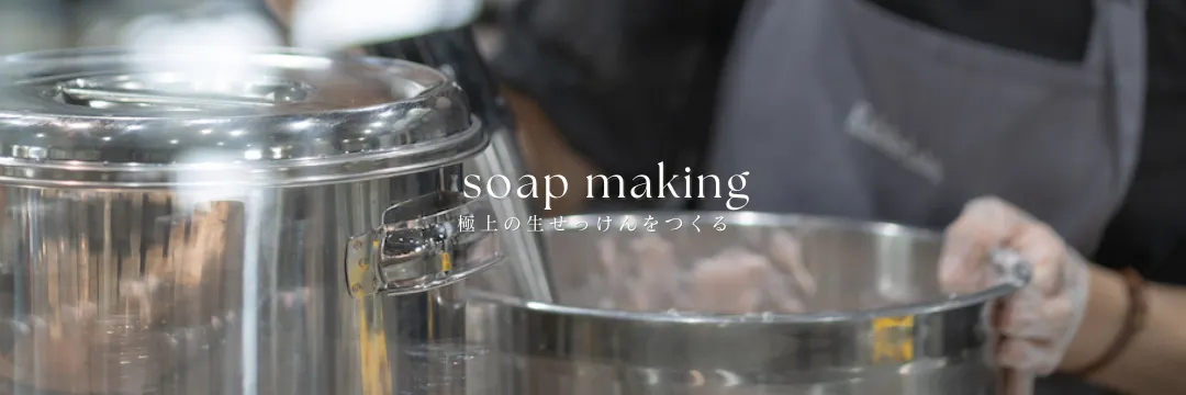 THEROSE32スキンケアシリーズの代表的な商品、生せっけん作りは、オリーブオイルを主原料の良質の植物油と水をアルカリで反応させてせっけん生地を作るところから始まります。