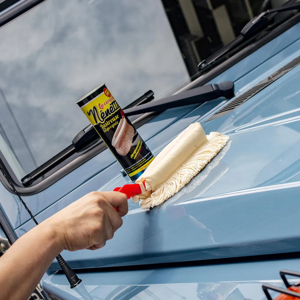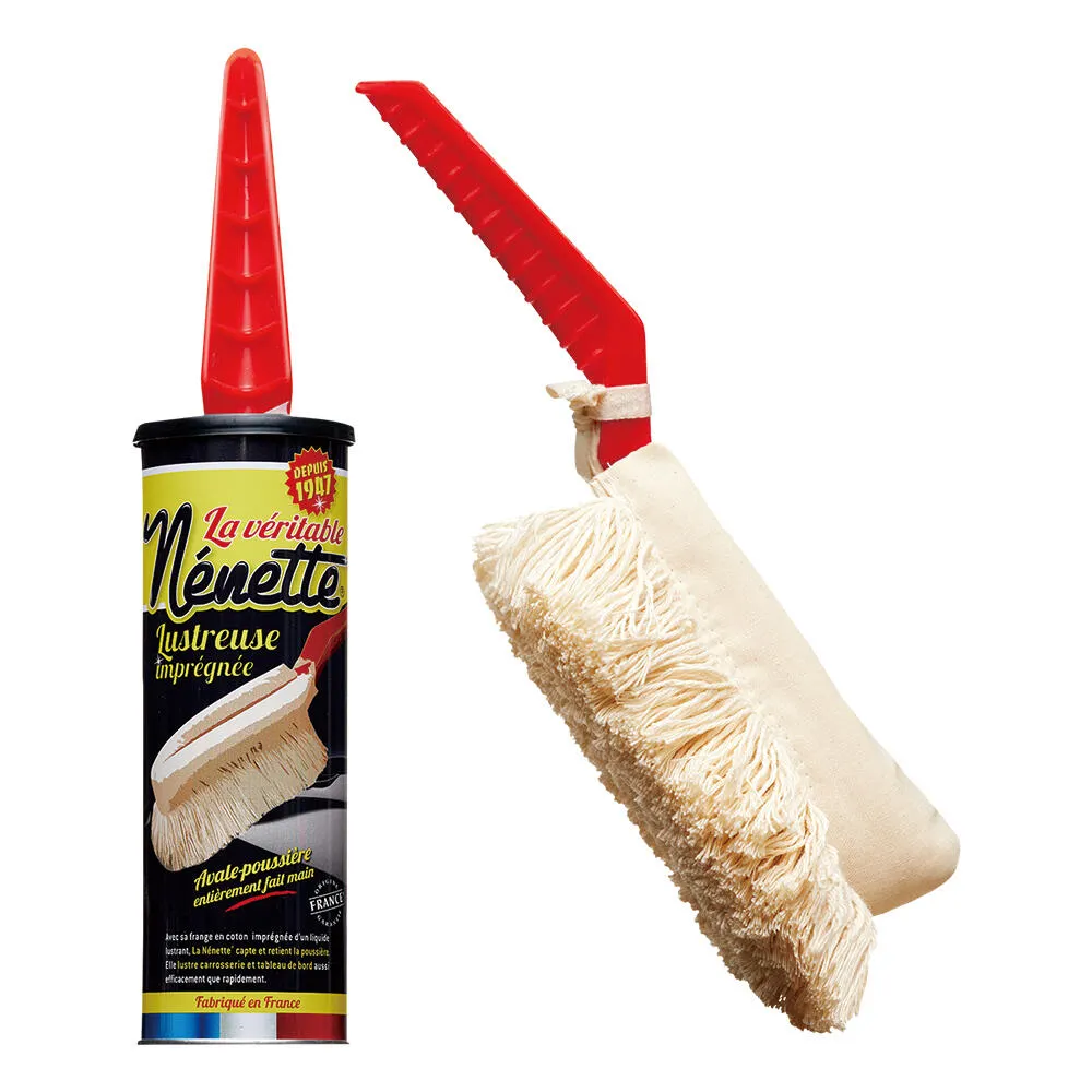 1947年にフランスで生まれたネネットは、洗浄剤と光沢剤を浸したコットンフリンジモップです。汚れやホコリをフリンジに吸着させ、同時に車体や車内のダッシュボードを瞬時に輝かせます。2度拭きも必要ありません。