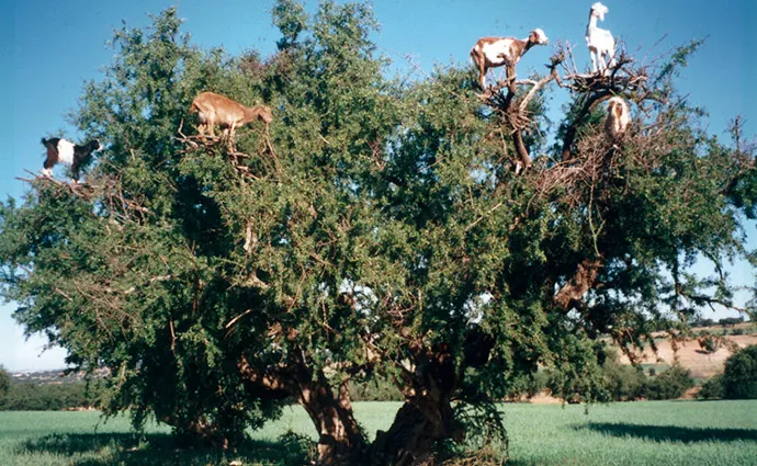 周辺大地を潤し、砂漠の拡大を防ぐアルガン樹の林は、ユネスコの生物圏保護区に指定されています。オイルの生産のために、アルガンの植樹を促進することは、地球環境保護に繋がっています。この写真はアルガン樹の実を食べようと、木に登ったヤギ。アルガンの実は砂漠のヤギの貴重な栄養源となっています。
