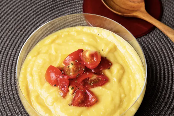 大豆とにんにくをすり潰して煮込んだクリーミーなポタージュ。スペイン、アンダルシア地方の名物「アホ・ブランコ(白いにんにくのスープ)」風に仕上げました。