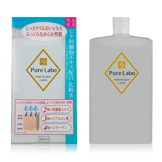 ~はずむハリ、驚きのうるおい~Pure Laboシリーズは、2種の幹細胞エキスを配合したパーフェクトオールインワンゲルをはじめとし、日本製の化粧品をラインナップ