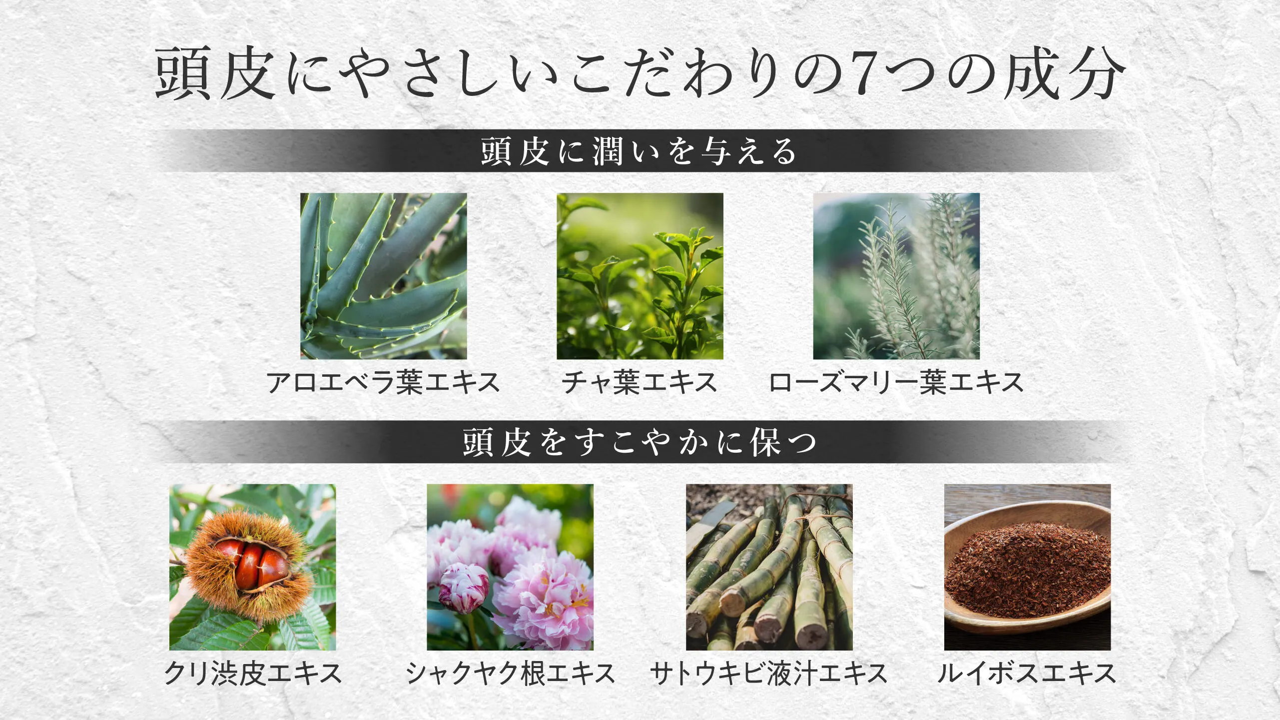 頭皮と髪に優しく、植物の力を存分に活かした処方を採用。化学合成原料に匹敵するナチュラルなエキスを7種類配合し、さらに髪に潤いを与える「ジヒドロキシプロピルアルギニンHCl」や、髪の表面を滑らかに整える「ポリクオタニウム-64」を贅沢にブレンドしました。頭皮と髪のすこやかさを守り、みずみずしい状態を保ちます。