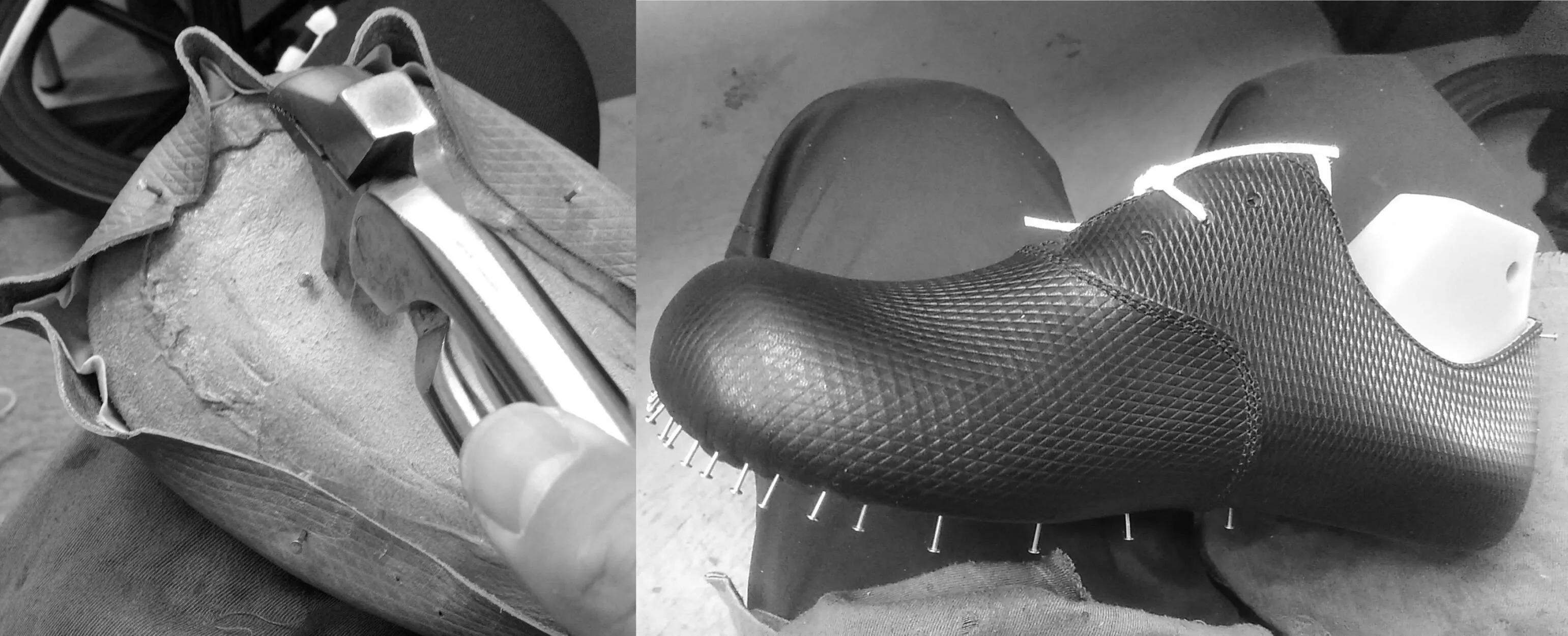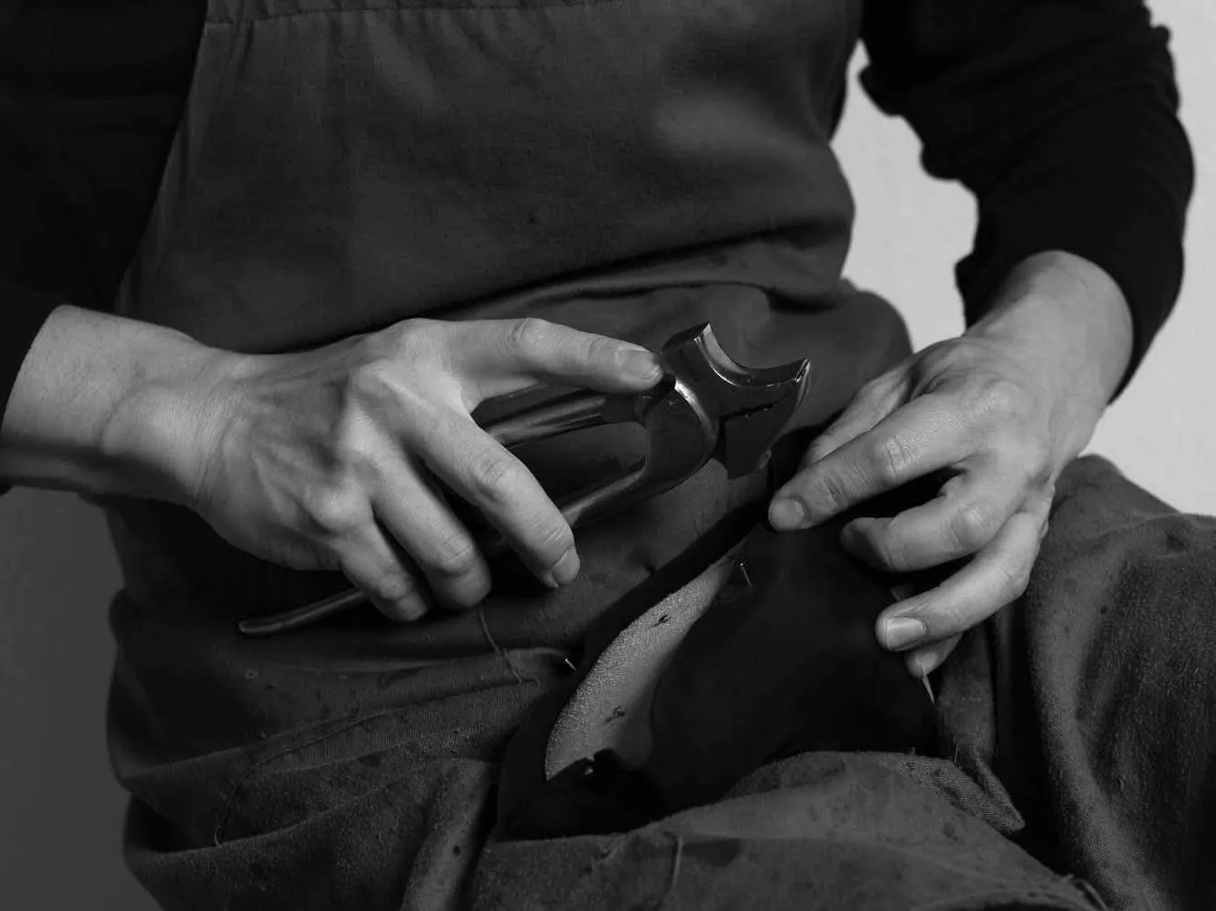 靴は、甲革パーツを手で裁断し、組み立て・縫製。つり込みも機械でなく手釣りで行っており、随所にハンドメイドによる作業で1足1足仕立てております。