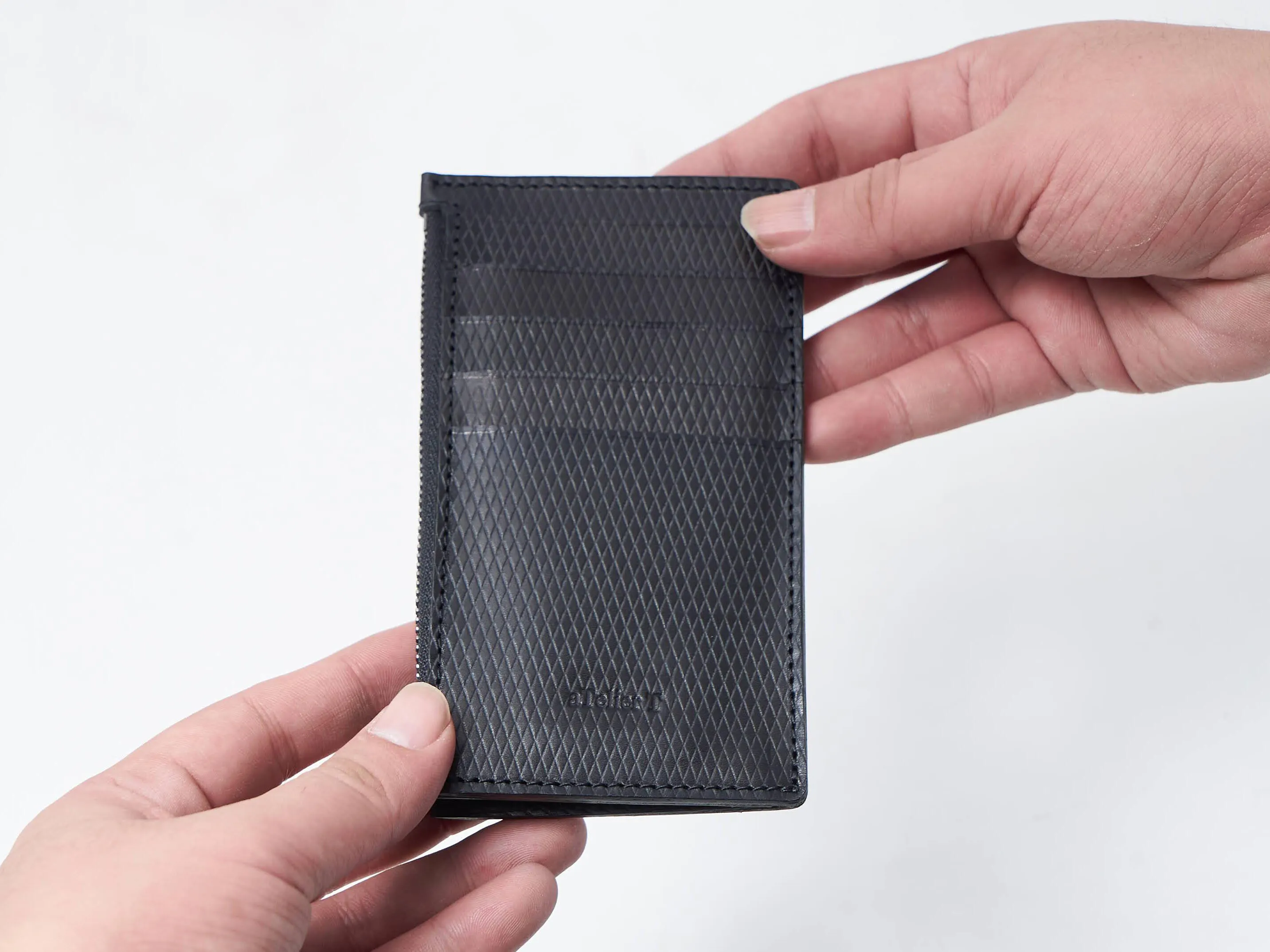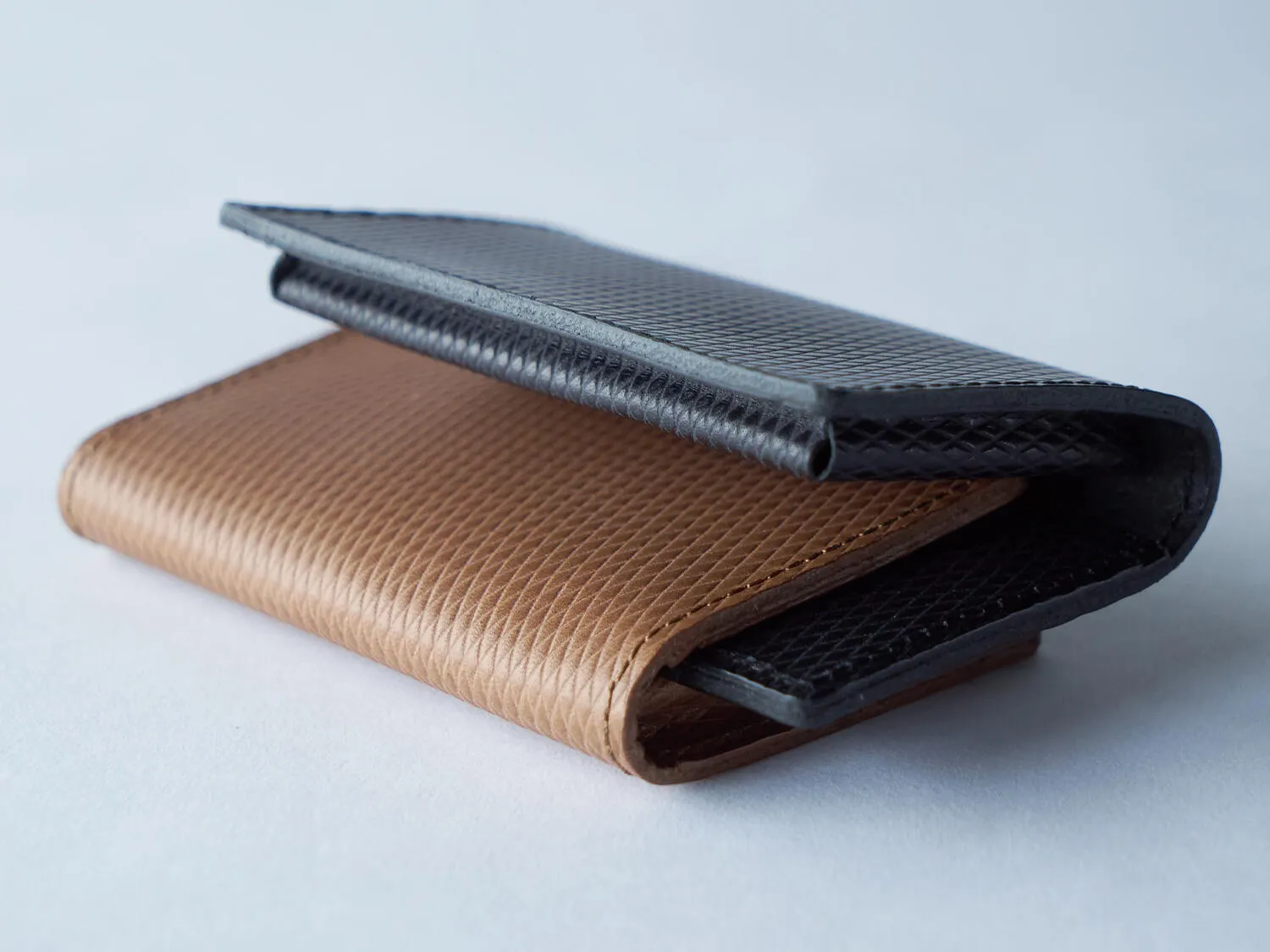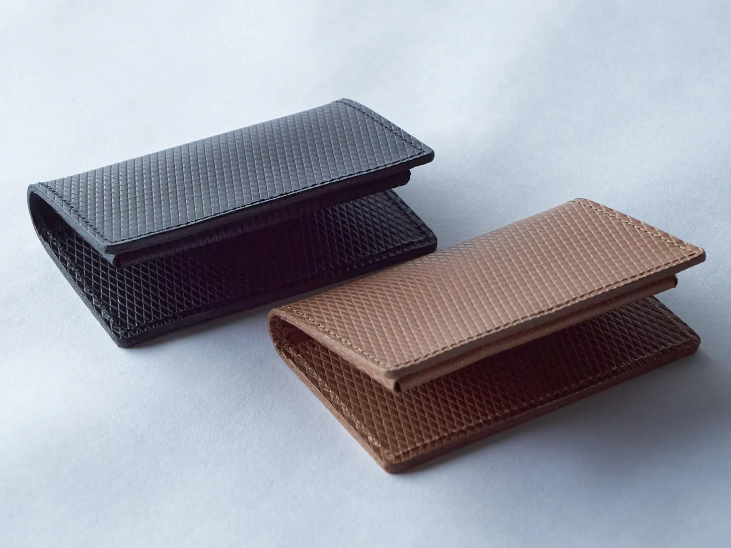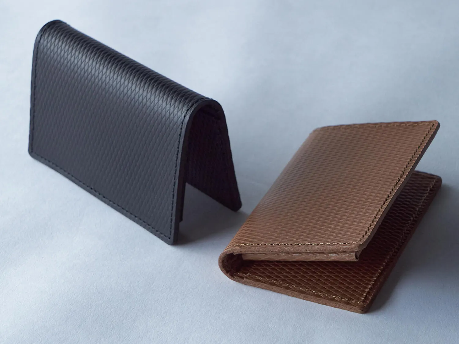 メインのポケットは最大50枚収納が可能で、対面には2つのサブポケットを設けており、充分な収納力があります。ひし形模様のロシアンカーフ調レザーがスタイリッシュ感を演出します。