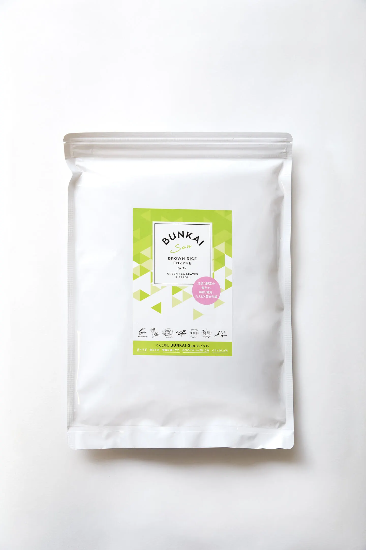 今回ご紹介するBUNKAI-Sanは、玄米酵素に、緑茶の粉末を加えた商品です。玄米酵素の豊富な栄養素に、カテキン・オレイン酸が追加され、緑茶の香りで、さらに美味しくなりました。