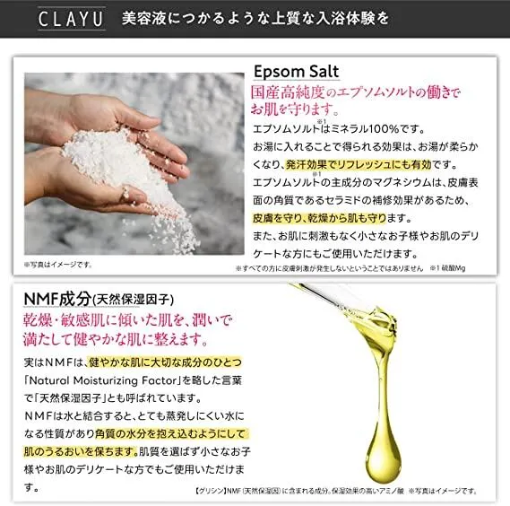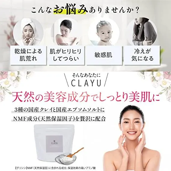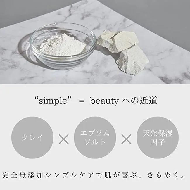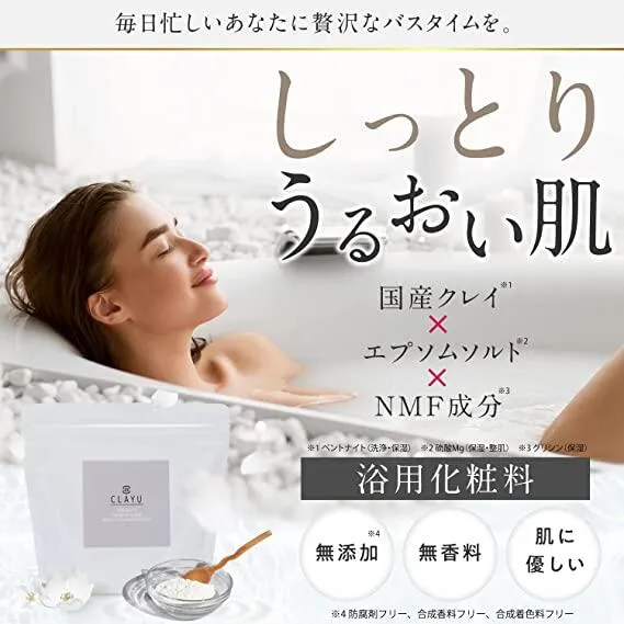 国産クレイ(ベントナイト)と国産エプソムソルトに、保湿力を高める天然成分を配合。無添加・無香料にもこだわり、しっとりうるおい肌を実現する品質と、肌へのいたわりをお届けします。