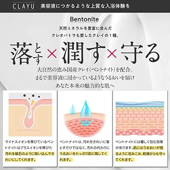 新潟、群馬、山形。特徴の異なる3つの産地で採取した、国産クレイを使用。国内有名温泉地と同等レベルの天然ミネラルを豊富に含み、「落とす」「潤す」「守る」ことで、高い保湿力を実現しています。