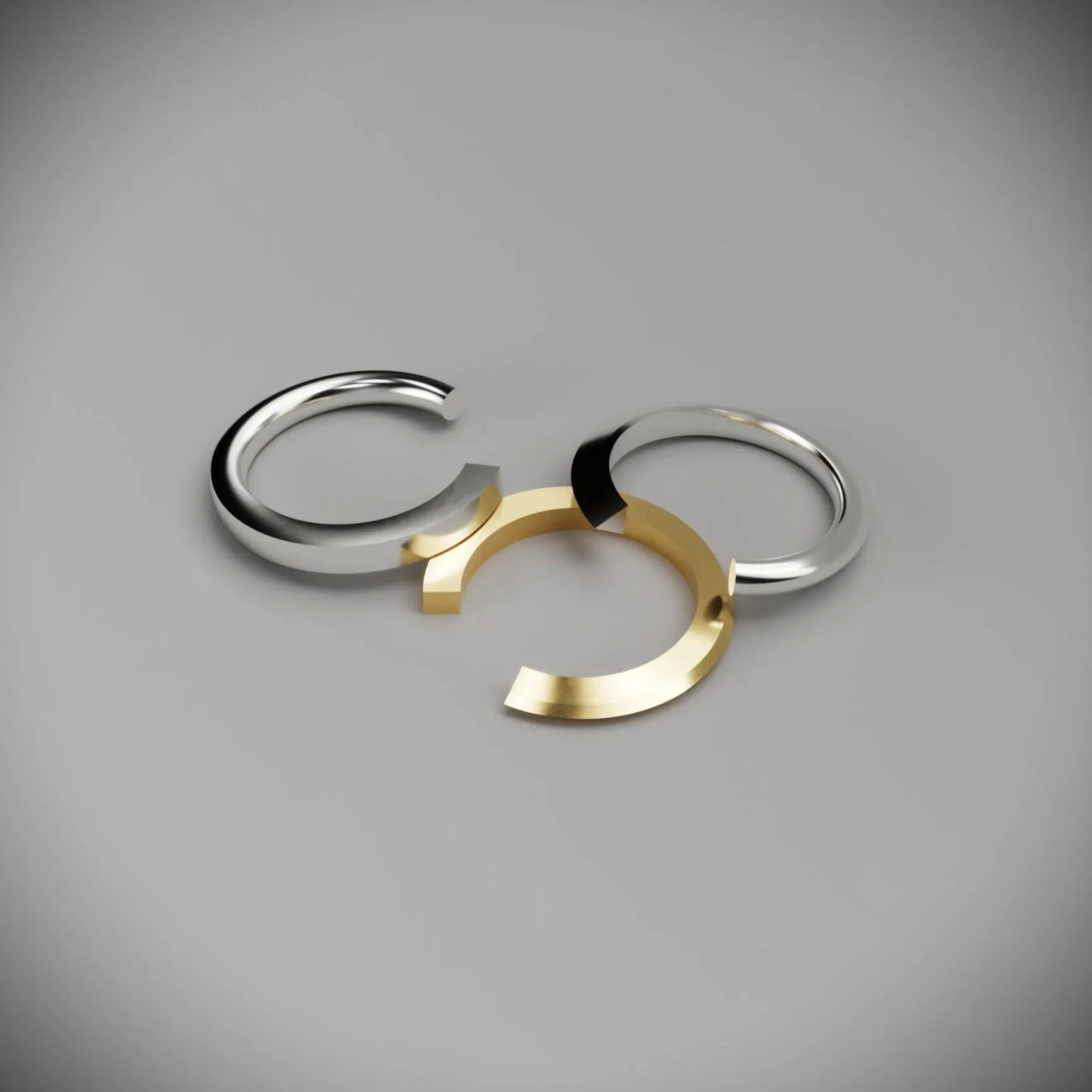 このコレクションは、異なる形状へのスムーズな遷移を特徴とするオープンリングのデザインを提供しています。 これらのリングは、デザインと工学の調和を象徴し、重ねて使うことで個性的なスタイルを楽しむことができます。