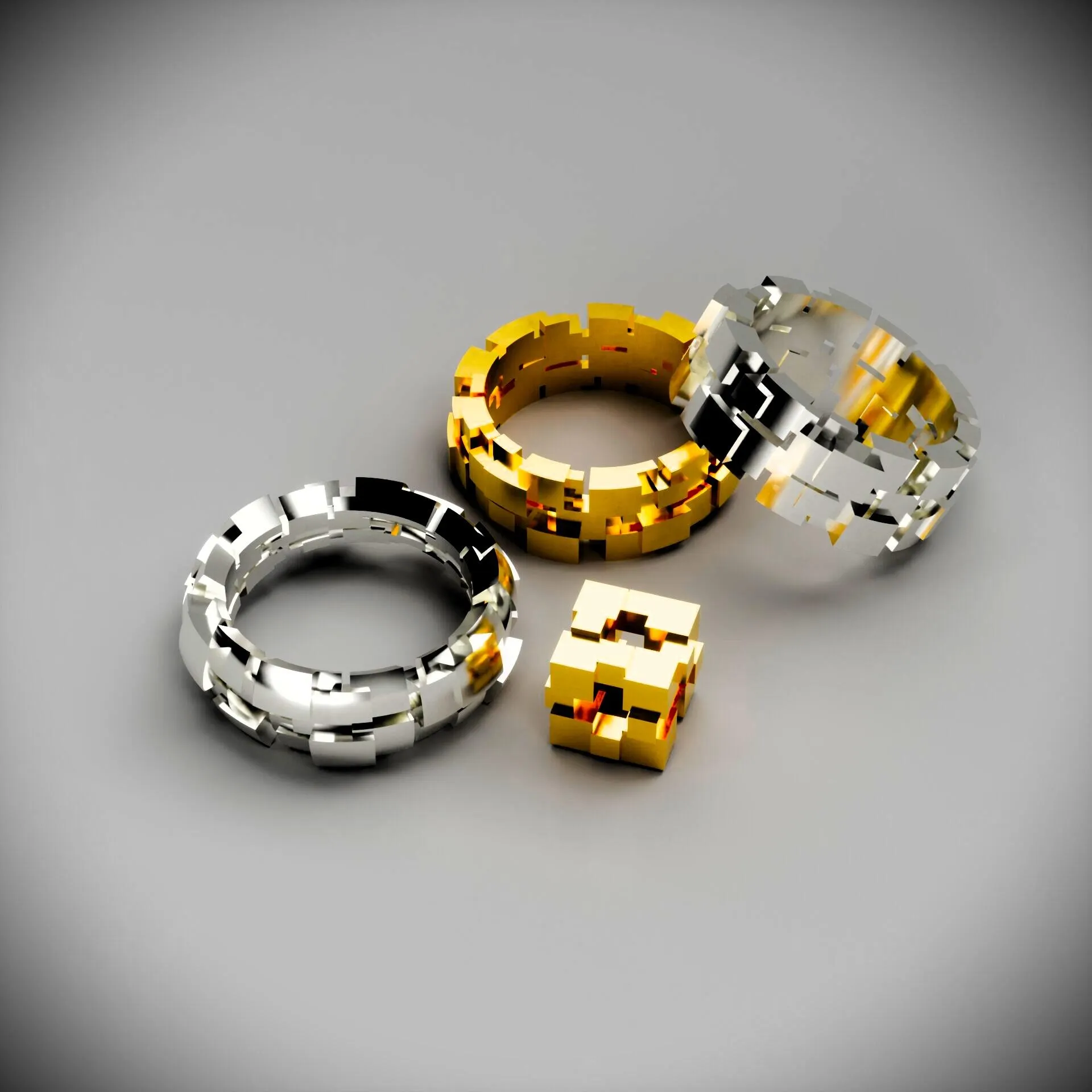 このデザインは、ジュエリーのデザインにおいて、円形の表面と立方体の形状を見事に組み合わせています。リングだけでなく、ネックレスとしても着用できるし、飾り物としても可能です。 これは3Dモデリングと付加製造技術の優れた使用例であり、美学と技術の融合を象徴しています。