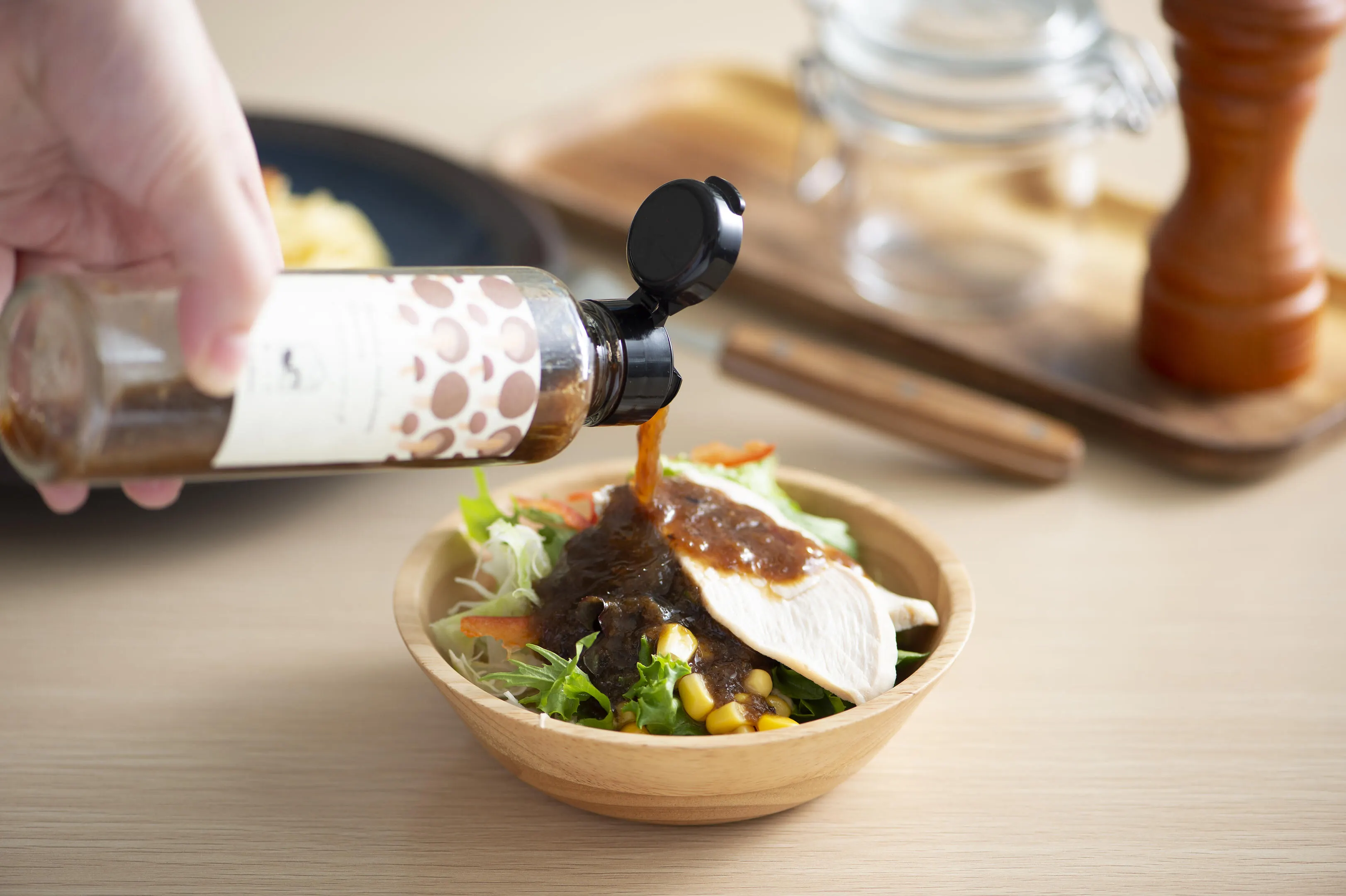 ゆずの酸味が香る和風ベースのドレッシングですが、ベースにも果肉にもしいたけをこれでもかッ!というほど入れた自慢の一品です。