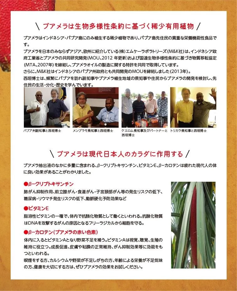 数千年もの間の食経験から害がなく、有益なものを選び、その中からパプア先住民が3万年もの間連綿と守り続けている赤い果実ブアメアに注目。