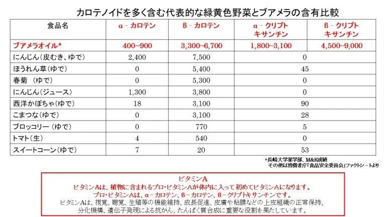 長崎大学薬学部との共同研究で、世界で初めてブアメラオイルにはベータ・カロテンの他に微量栄養素として最も重要なベータ・クリプトキサンチンが豊富に含まれていることを明らかにしました。