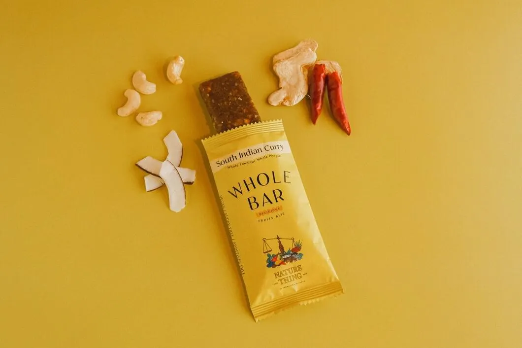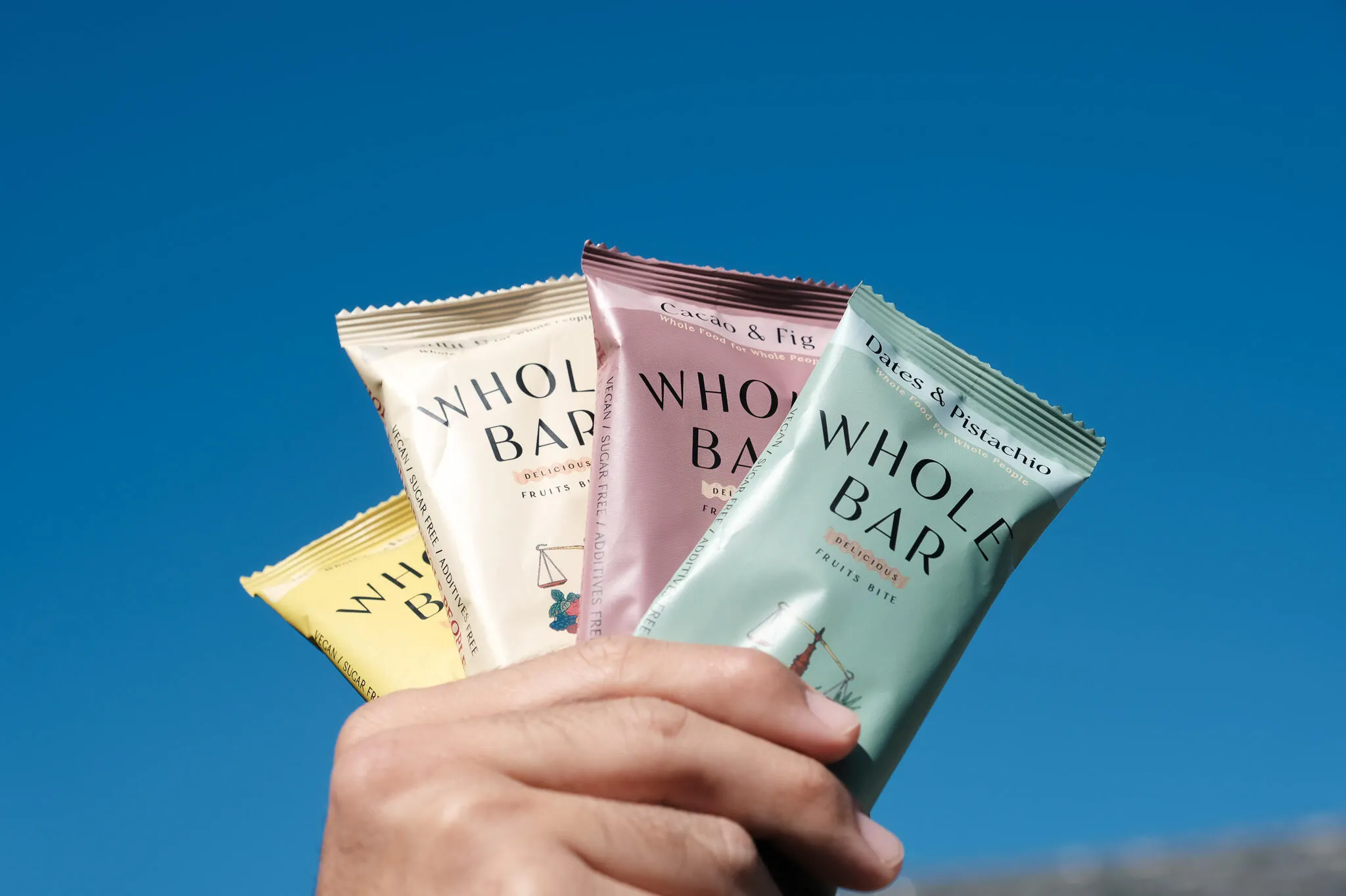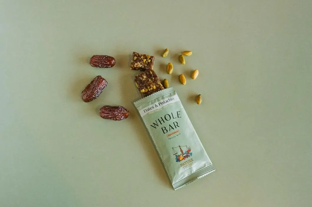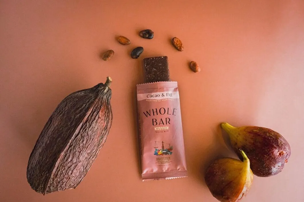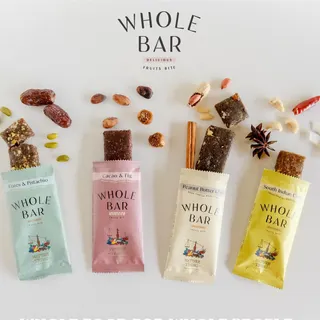 WHOLEBARは、「自然の素材を丸ごと食べられる、100%ナチュラルエナジーバー」です。WHOLEとは丸ごとという意味で、果樹から収穫したフルーツをそのまま食べているような感覚で食べられる、とてもシンプルなエナジーバーです。