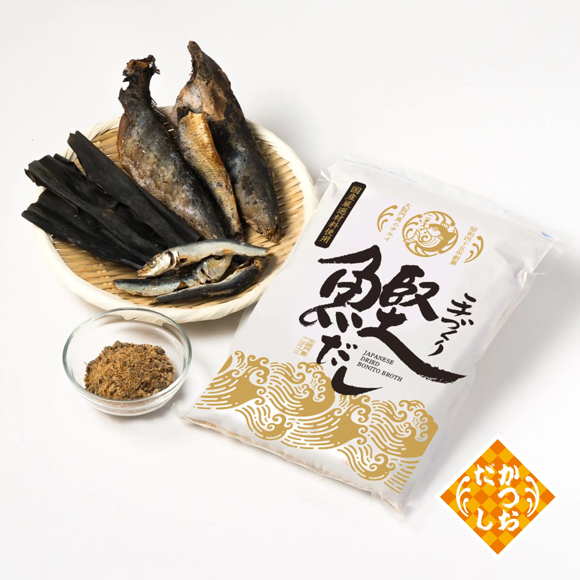本製品は出汁パックではなく、粉末状のだし素材です。お客様自身で袋に詰めるか、濾して使用するスタイルとなっており、より自由な調整が可能です。また、2番だしまで使用でき、出汁を取った後の素材は乾燥させてふりかけとしても活用できます。