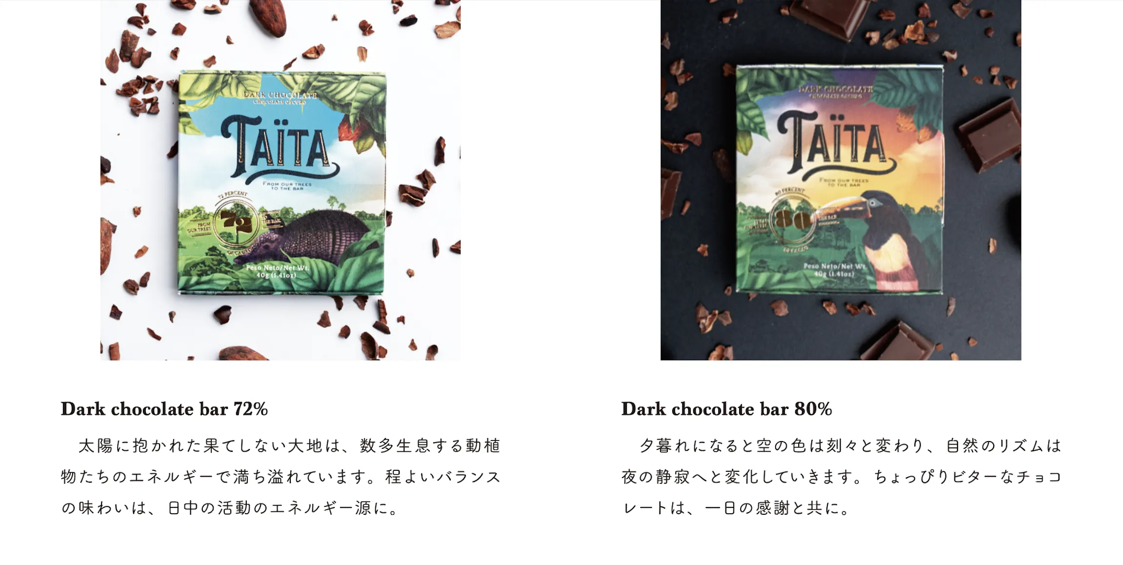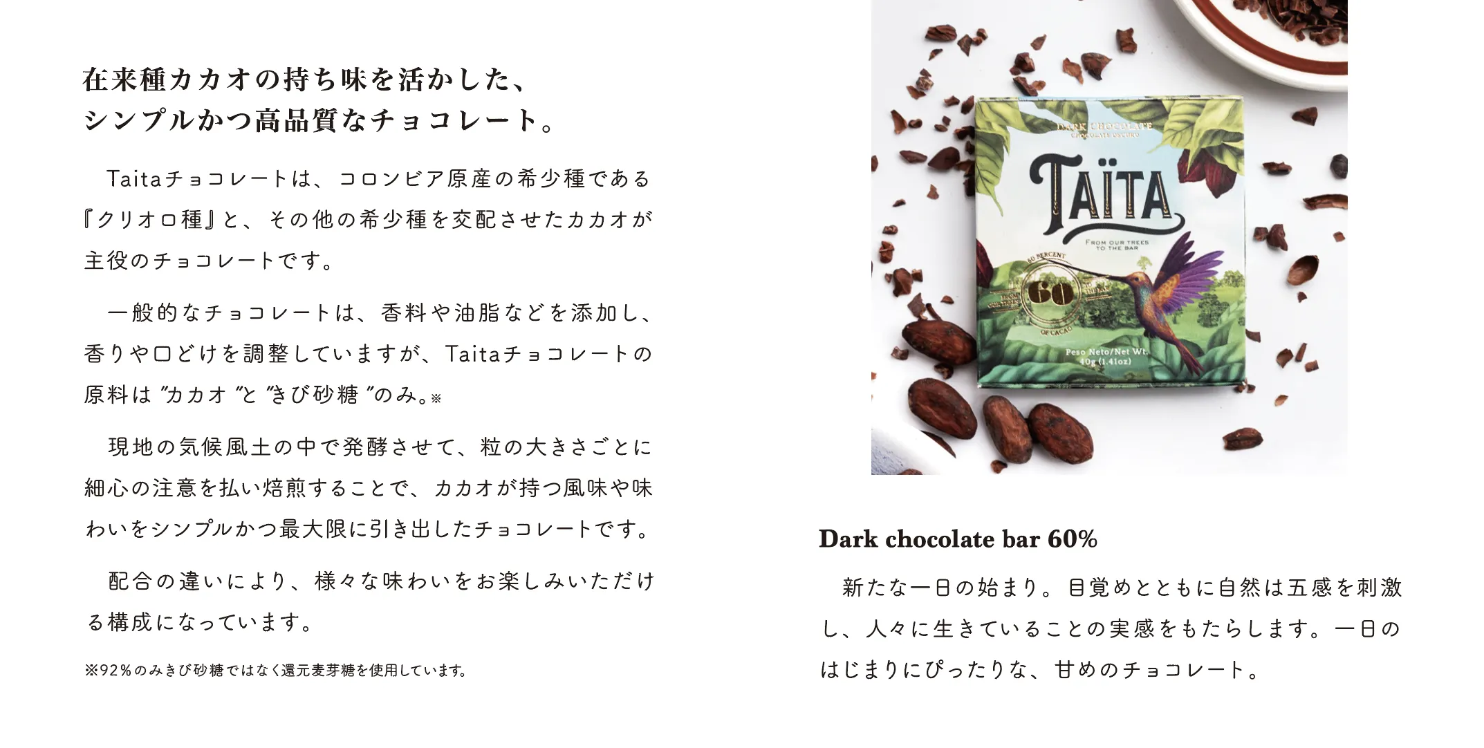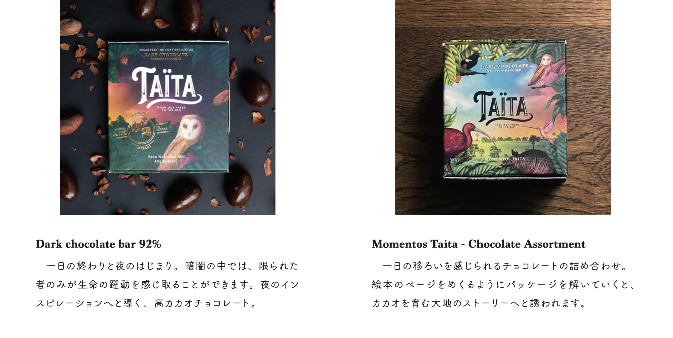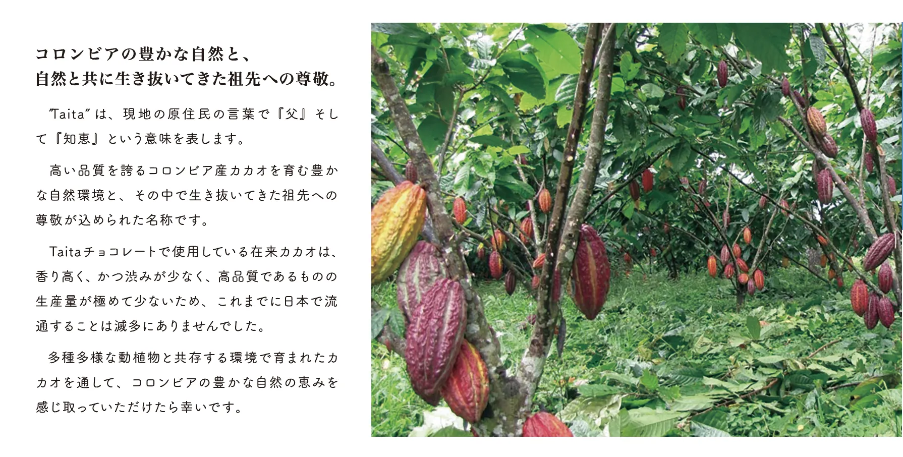”Taita”は、現地の原住民の言葉で「父」そして「知恵」という意味を表します。高い品質を誇るコロンビア産カカオを育む豊かな環境と、その中で生き抜いてきた先祖への尊敬が込められた名称です。