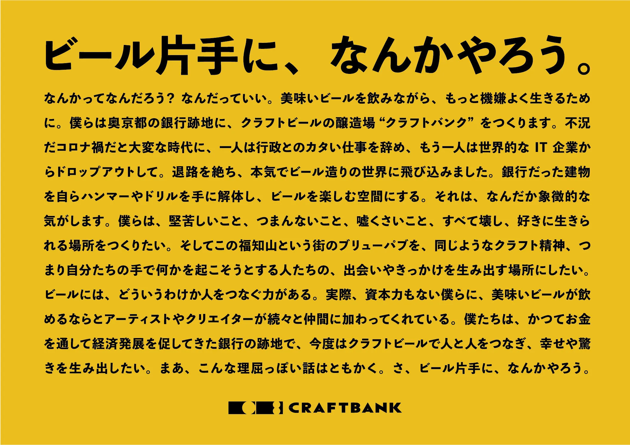 私たちのゴールは、CRAFT BANKが単なるビールブランドではなく、ビール片手に新しい出会いや刺激を楽しめる、そんな体験を提供することです。