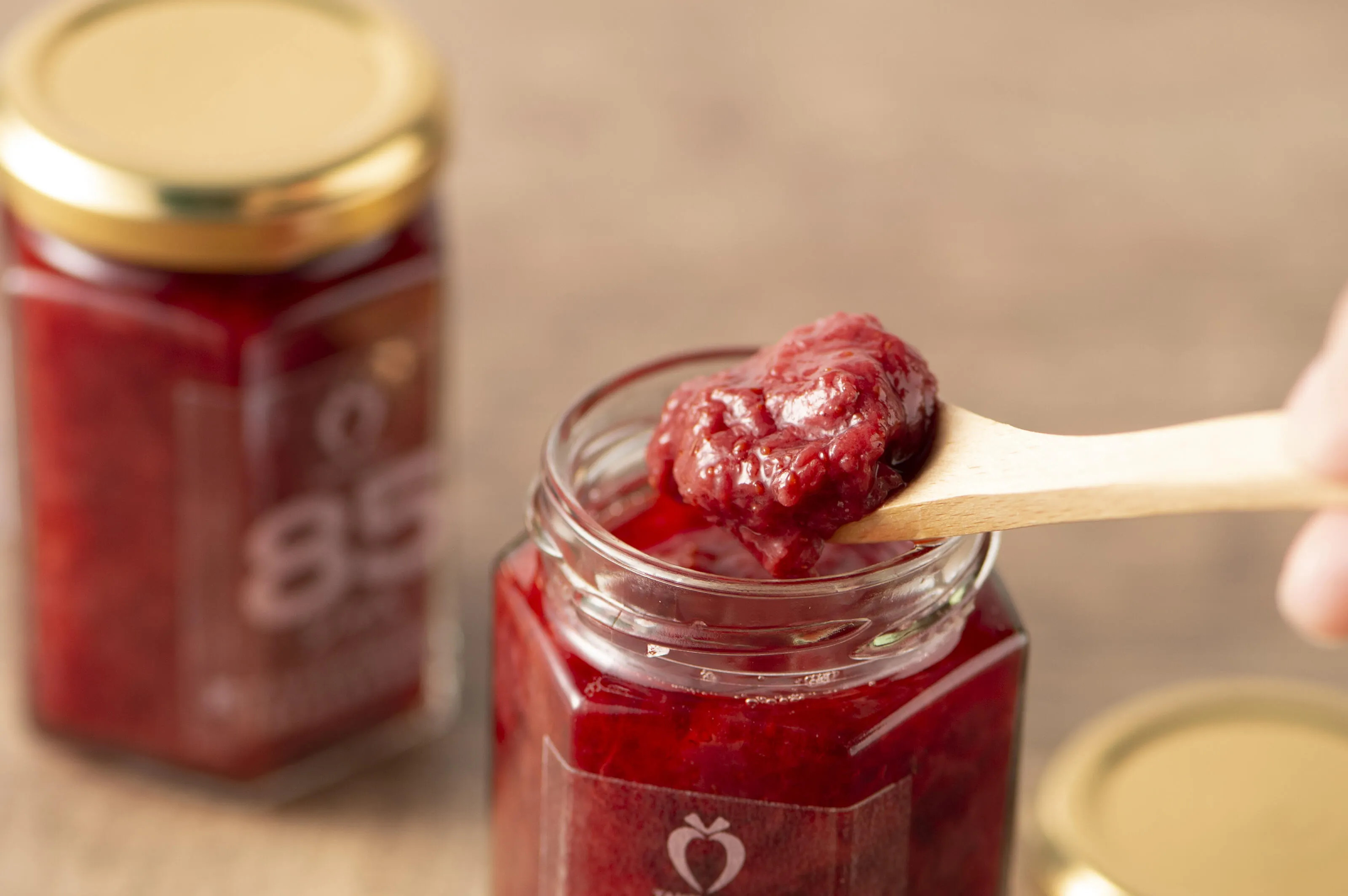 と言われるのも当然。いちごの含有率が85%で砂糖は控えめ。素材の味が際立っているので「あまおうそのものを食べているよう」とのご感想をいただいています。
