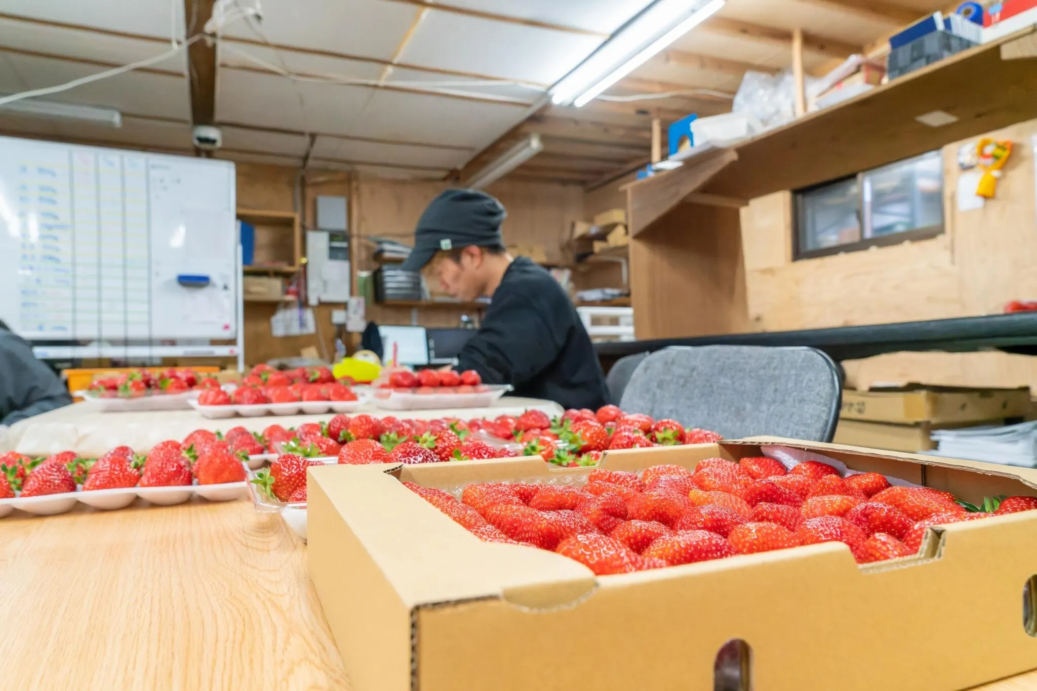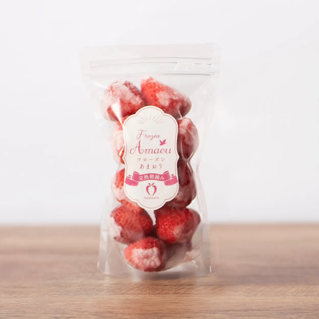 完熟収穫した朝摘みあまおうを、その日のうちに鮮度保持装置にて冷凍保存しているのでおいしさをキープ。スムージーの材料やそのまま削った削りいちごに練乳をかけたり、冷たいいちごを楽しんでいただいてます。