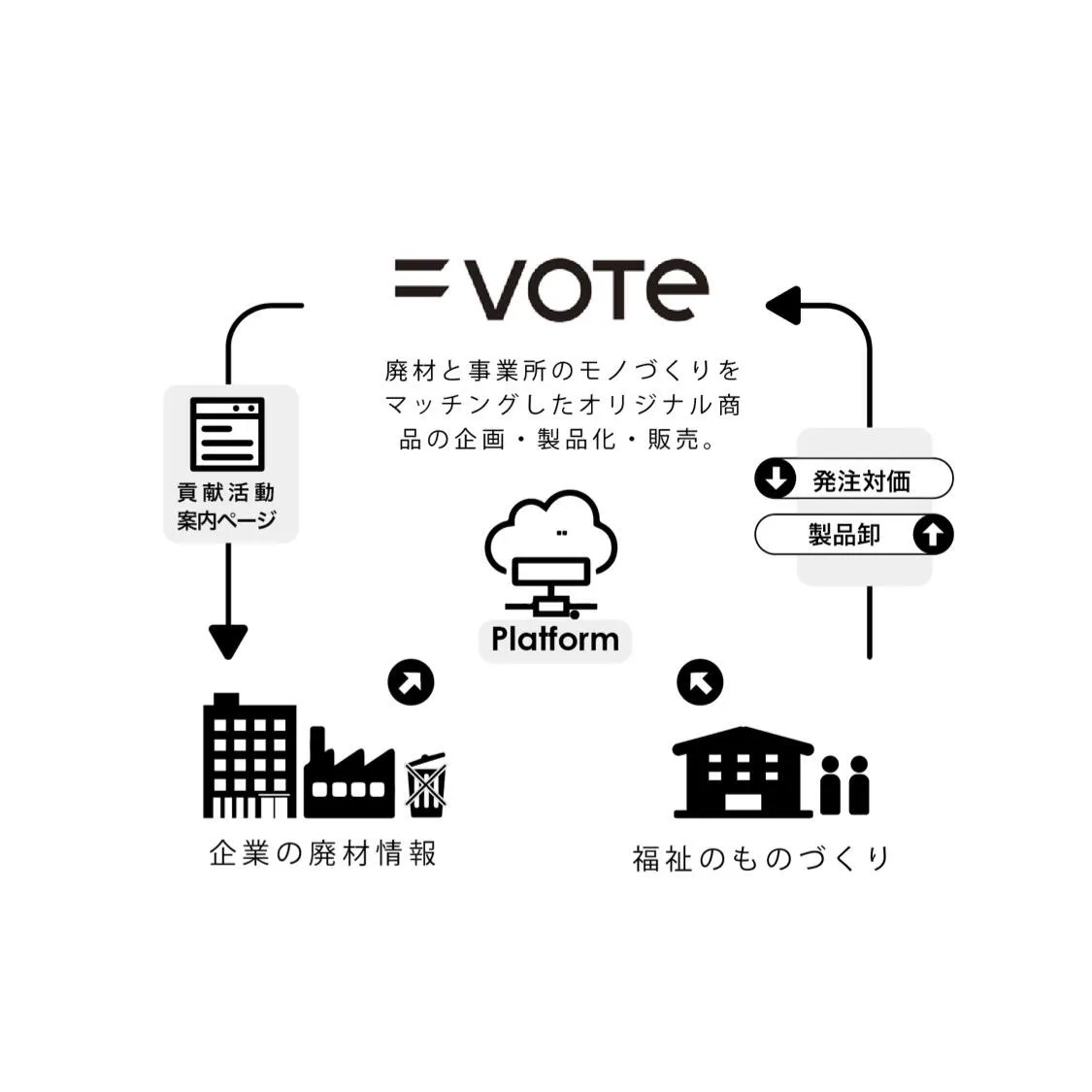 =vote[イコールボート]は、障がいのある方の生き方が豊かになる福祉と企業の接点を創るプロジェクトブランドです。 福祉施設のものづくりと可能性、創造性を伝え、その価値を発信していきます。 企業から出る廃材や困り事と福祉施設の得意なことを掛け合わせたプロダクトを企画。 わたしたちの活動を通じて、社会や経済そしてより多くの人が福祉施設から生まれたアートや商品と出会い、福祉施設が企業や地域と交じり合い多様な発展を生み出すことを願っています。「企業が福祉施設と当たり前に協業する」そのような文化ができることを目指しています。