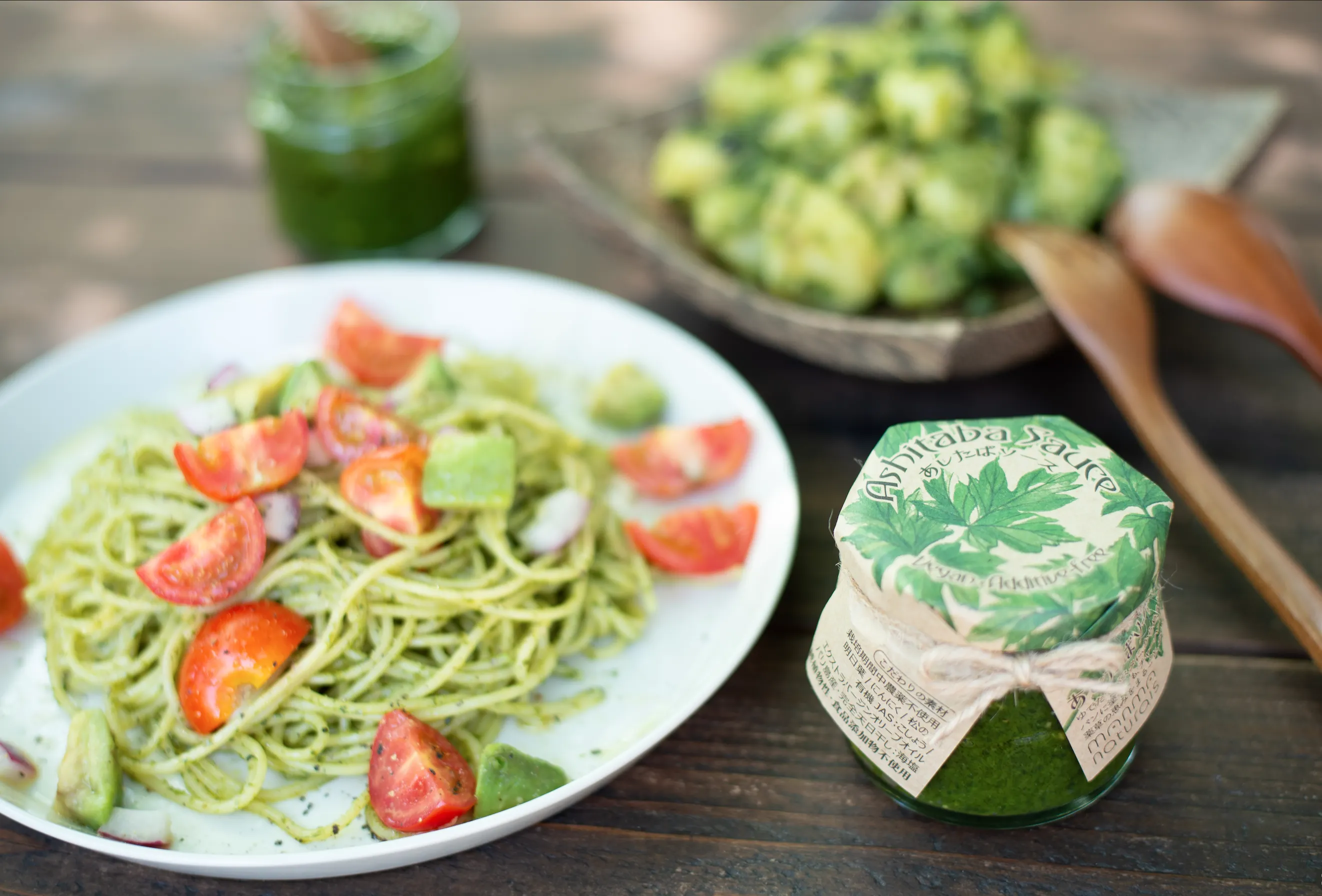伊豆大島の小規模農家から直接仕入れた無農薬の明日葉でジェノベーゼを作りました。生の明日葉の葉っぱをペストソースにしたのはマンマが初めてです。