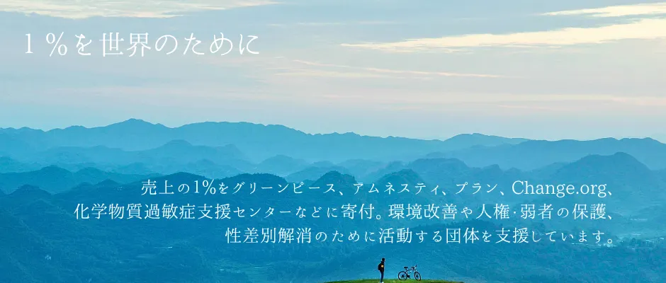 売上の1%をグリーンピース、アムネスティ、プラン、Change.org、化学物質過敏症支援センターなどに寄付。環境改善や人権・弱者の保護、性差別解消のために活動する団体を支援しています。
