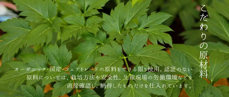 オーガニック・国産・フェアトレードの原料をできる限り使用。有機JAS認証のない原料も、小規模オーガニック農家をサポートするために積極的に採用。栽培方法や安全性、生産現場の労働環境などを直接確認し、納得したものだけを仕入れています。