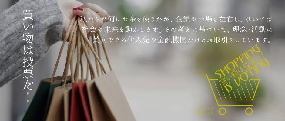 私たちが何にお金を使うかが、企業や市場を左右し、ひいては社会や未来を動かします。その考えに基づいて、manma naturalsの製品を買うことで世界が良くなるように、弊社では理念・活動に賛同できる原材料の仕入先や金融機関だけとお取引をしています。