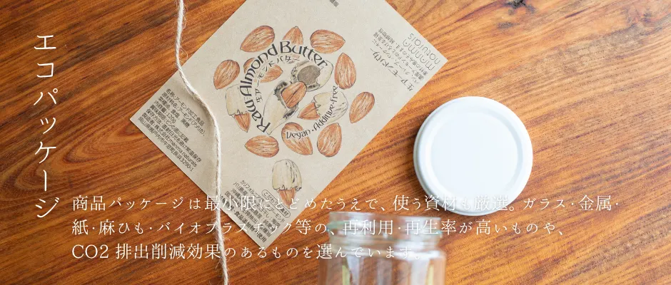 商品パッケージは最小限にとどめたうえで、使う資材も厳選。ガラス・金属・紙・麻ひも・バイオプラスチック等の、再利用・再生率が高いものや、CO2 排出削減効果のあるものを選んでいます。
