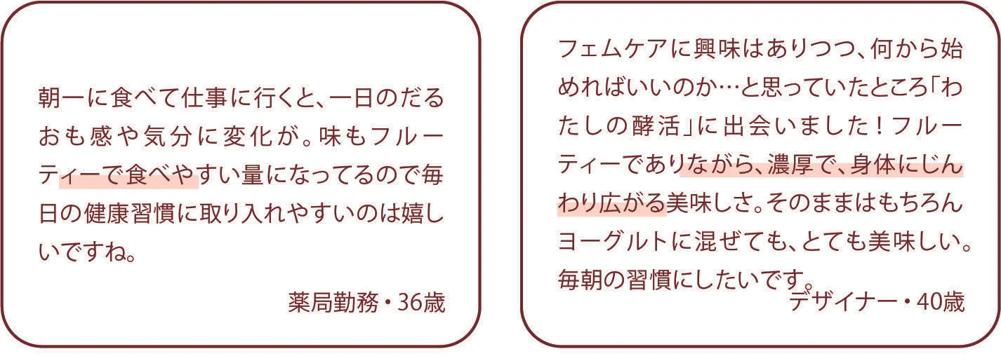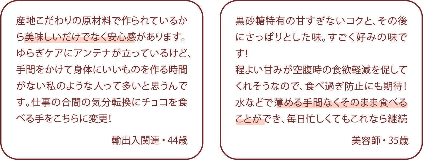 味わいにもトコトンこだわり、試作を重ねました。たくさんの女性たちに試食をいただき、1年以上をかけて完成した製品は、まるでジャムのような味わいが好評いただいております。