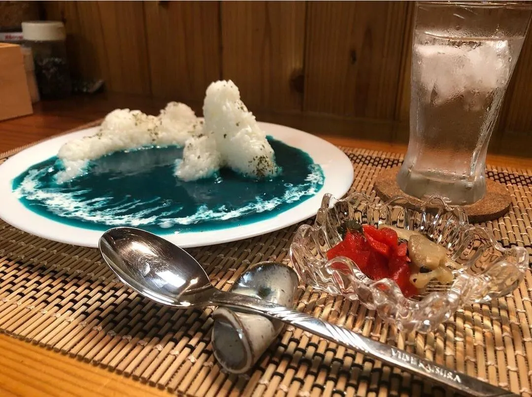 由良町には「日本のエーゲ海」とも言われる白崎海洋公園があります その白い岩山に映える碧い海・碧い空がマッチした世界観を表現できればと カレーを碧くしました。