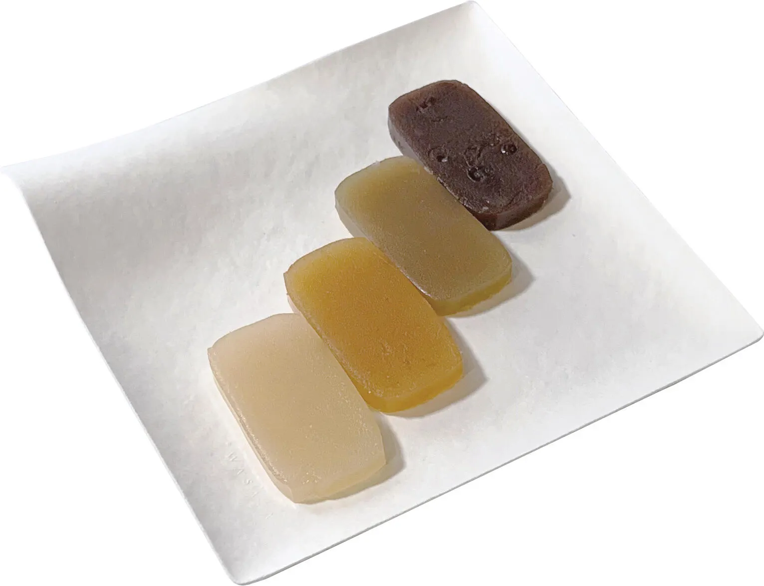 「倉吉彩りようかん」は、栃羊羹、白羊羹、小倉羊羹、梅羊羹の4種類を、それぞれ食べやすいサイズに切り揃え、色々な味を手軽に楽しめる詰め合わせになっています。一つ一つをフィルムにはさんでいるので、切る手間なく、手も汚さずにお召し上がりいただけます。