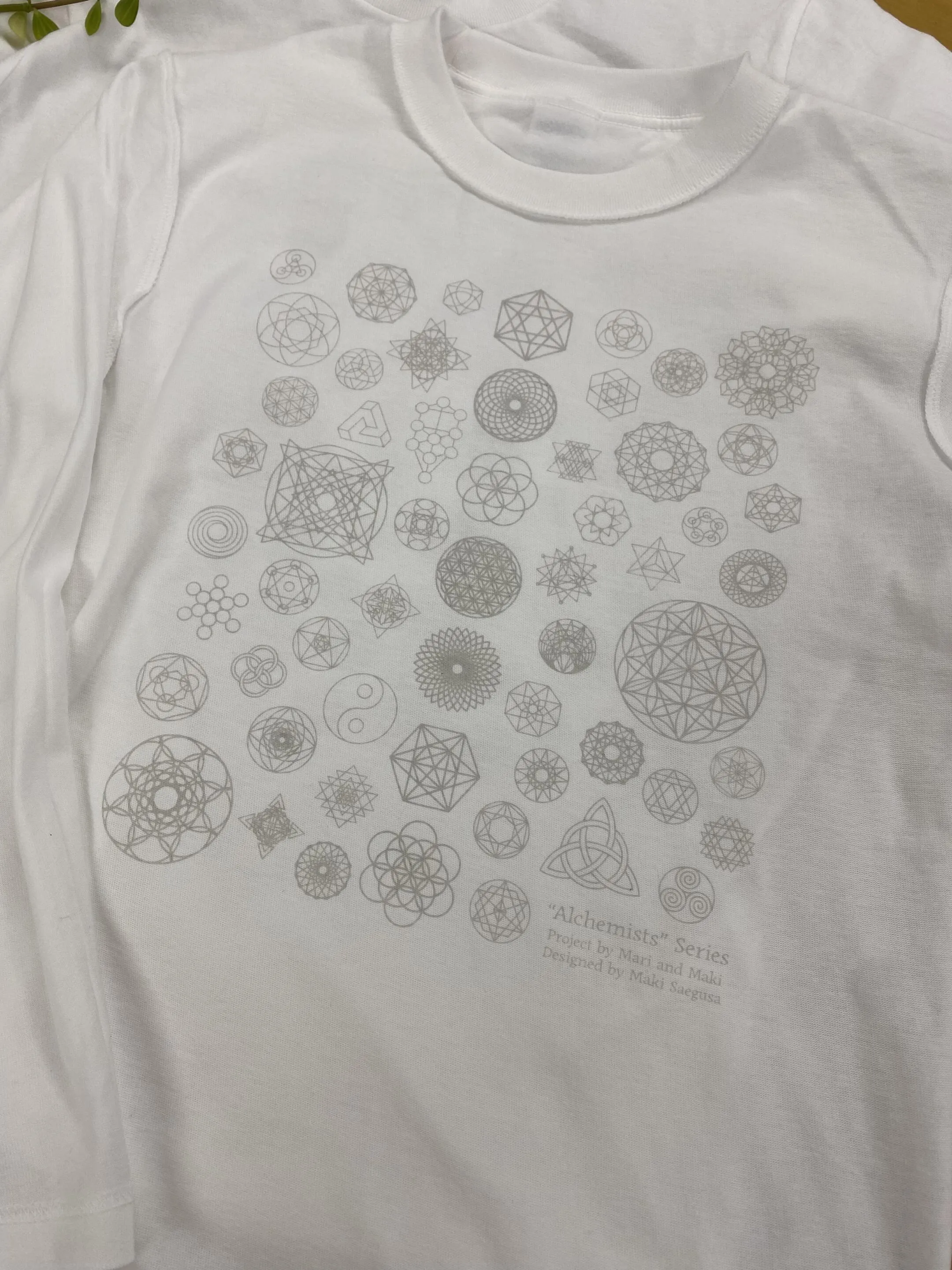 Tシャツの中面の裏と表に、北海道上ノ山町で採掘される遠赤外線が出るブラックシリカの石を職人さんに特殊加工で神聖幾何学をプリントしています。Tシャツは、白とインディコの半袖(秋から長袖)。鉱石のパワーと神聖幾何学の力で守られている感を感じる新感覚なTシャツです。でも実はこちらの発案は、20年前で、しばらくやめていましたが、このシリーズを作り再販いたしました。20年前、エーテル体という言葉がわからない時代で、かなりの枚数を口コミで販売いたしました。