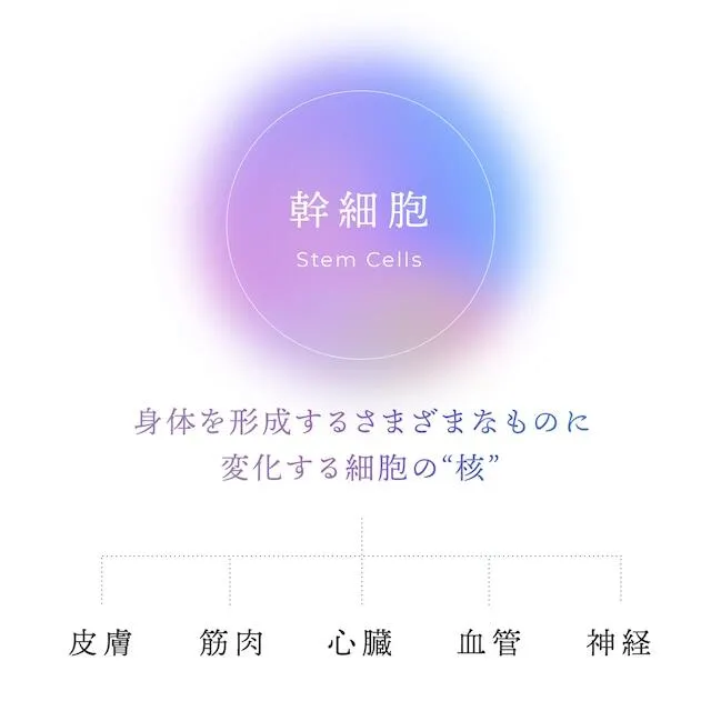 約60兆個あると言われる人間の細胞。その核となるのが幹細胞です。 幹細胞とは人の身体を形成するうえで、臓器や血液などさまざまなものに変化する能力“分化能”を持つ物質です。 その特性を活かし、再生医療の分野では怪我や病気などでダメージを受けた組織を治療するための成分として期待されています。