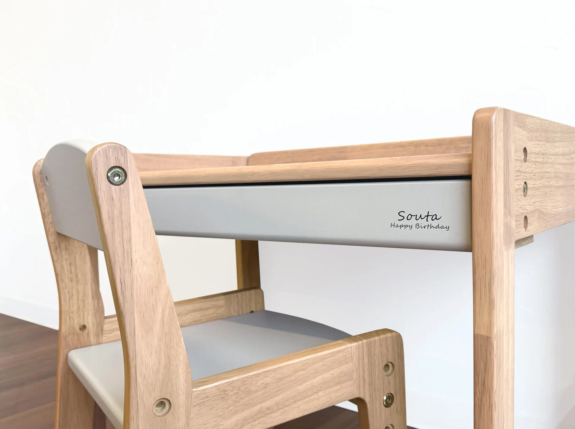 お名前やメッセージを入れることで、お子さまが大きくなった時に『喜ばれて生まれてきたんだな』と感じることのできる、そして記憶に残るベビーチェア・キッズデスク&チェアです。