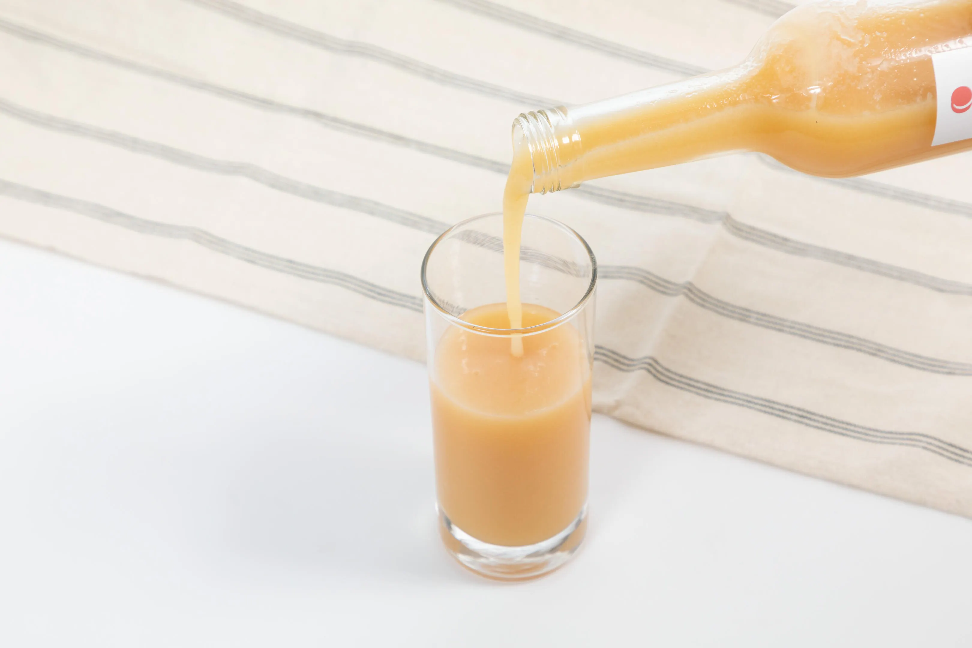 1パックにあら川の桃1.5玉を贅沢に使用し、桃そのものの味をひきだし、丁寧に裏ごししました。桃の繊維はそのままに、とろみと美味しさを残した飲み切りタイプの桃ストレートジュースです。