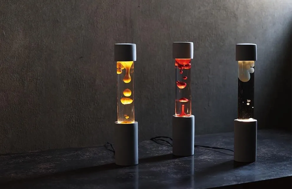 点灯すると呼吸をするように流動的に形を変えながらコンクリートの筒を行き来するラバランプです。従来のラバランプの概念を一新し、無機質なコンクリートの筒と有機的に動く光の対比が魅力的です。間接照明としての機能性はもちろん、ずっと見ていても飽きないインテリアアートとしても活躍します。その独特の動きは、空間に静かな生命感をもたらし、モダンなインテリアに絶妙なアクセントを加えます。
