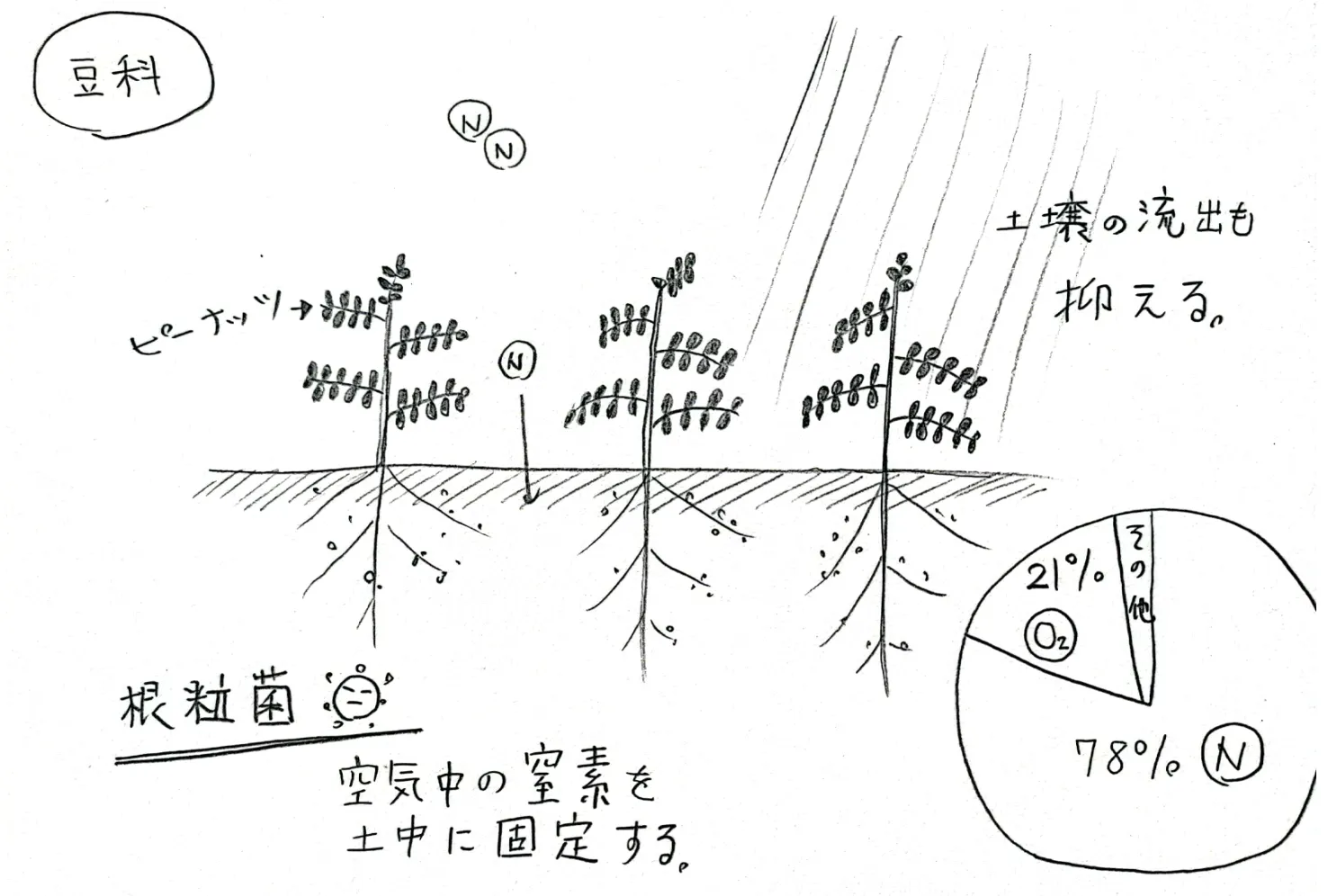 ・土中に豆をつくるピーナッツは、土の有機物を増やし、土をふかふかにします