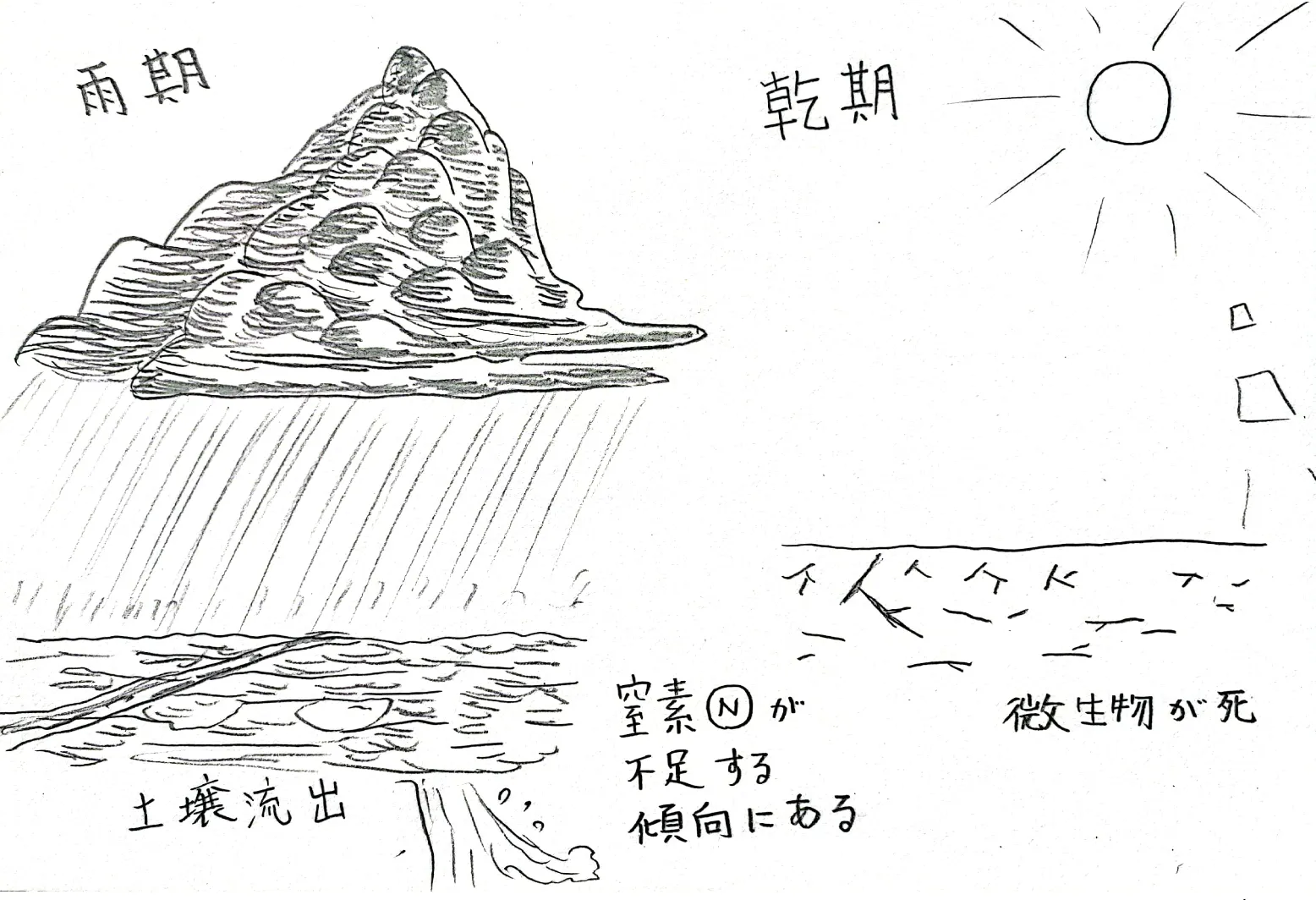 ・乾期は、直射日光により、土地が乾燥し、微生物が死滅します。