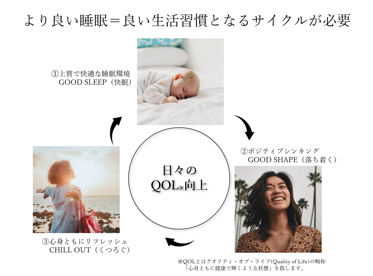 当社の願いは、そんな不眠や不調に悩む人々へ当社の製品が少しでもよりそうことで、世界中の人々のQOL向上をサポートしていければと願い行動しています。
