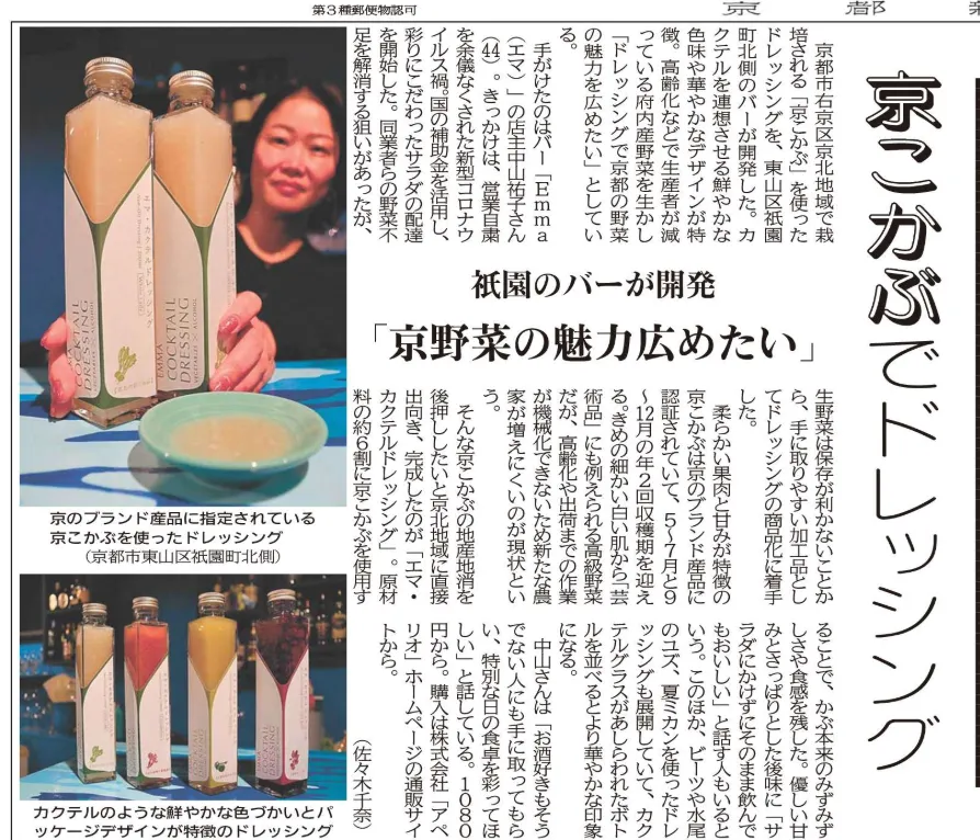 創業は2014年に京都祇園でBarを始めました。コロナで客足が遠のく中で、補助金(事業再構築補助金)を頂き、地元京都の伝統野菜・ブランド野菜を使ったドレッシングの製造販売を始めました。生産量が少なく、栽培が難しい京野菜が更に世の中に広まればという思いで作りました。