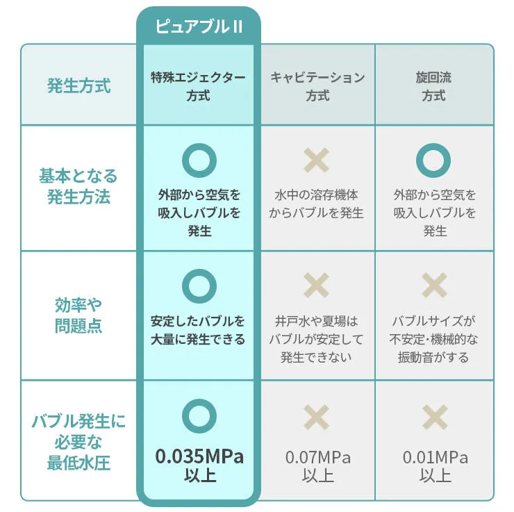 特殊エジェクター方式は旋回流方式、キャビテーション方式と比較した場合、気泡径の最終調整や厳格な品質管理が求められますが、他2方式にはシャワーに使用した場合クレーム対象となるべき問題点がありましたので、当社ではすべてをクリアした特殊エジェクター方式を採用しました。